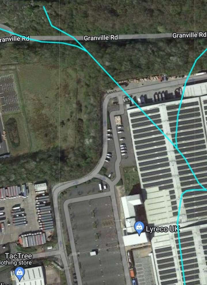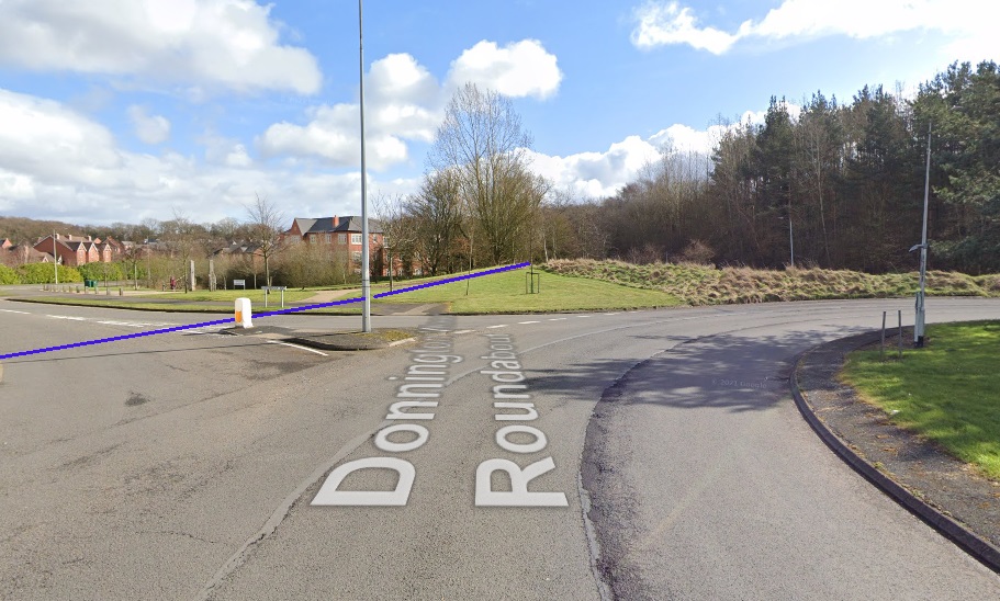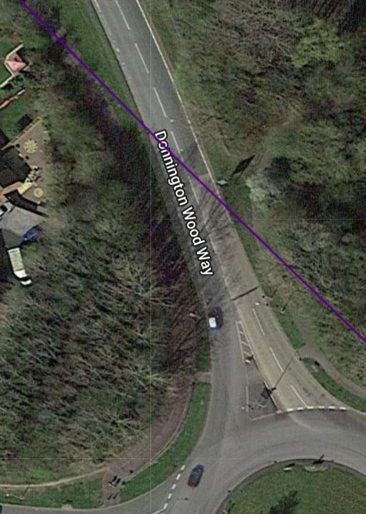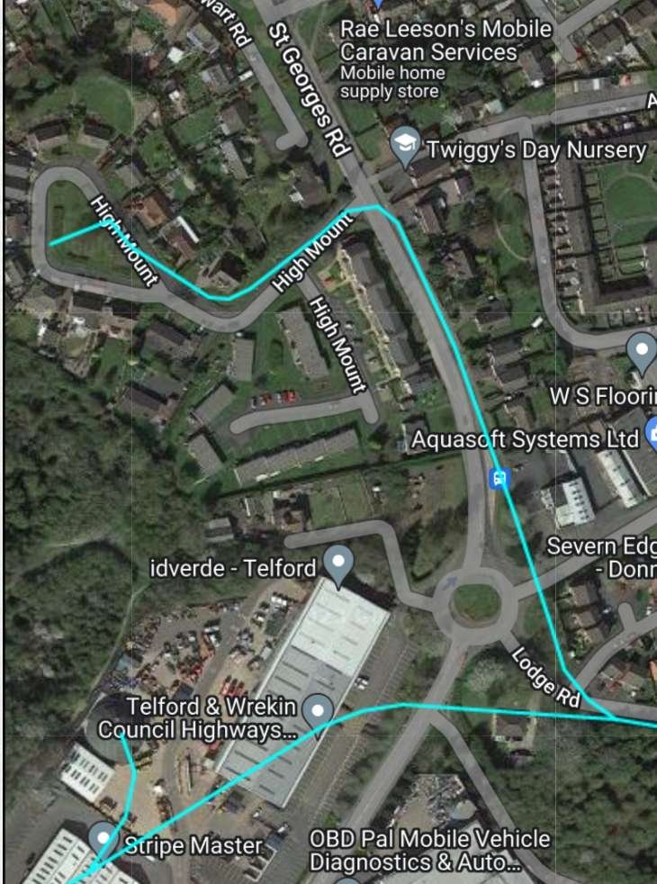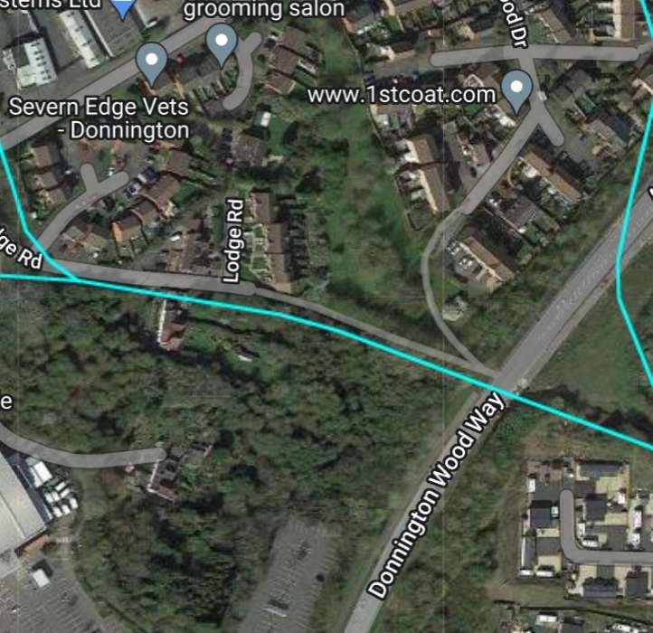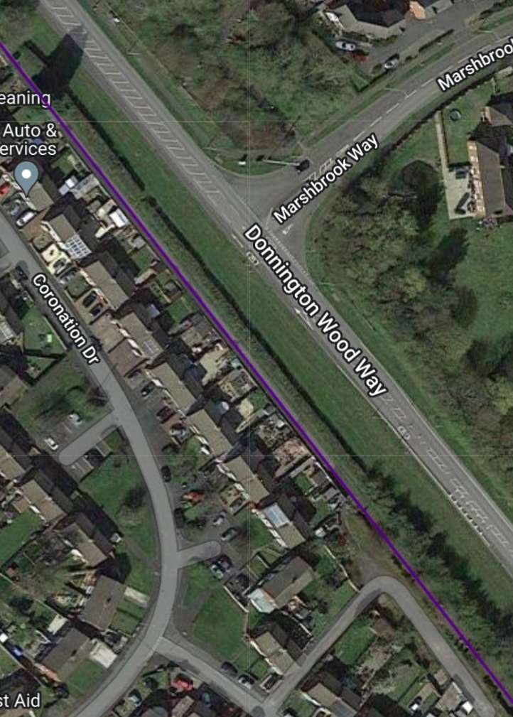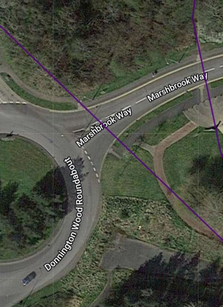 This satellite image is taken from the ESRI image set supplied by the National Library of Scotland. The road shown running North-northwest to South-southeast across the centre of the image follows the formation of the old tramway/railway. In the bottom right of the image a bridge carries the modern A518 over the road just mentioned. That bridge and the A518 are on the line of the old LNWR mainline through Donnington. The bridge is at the same location as the bridge carrying the LNWR line over the tramway/mineral railway. [8]At the same scale as the satellite image above, this ESRI image shows the road with continues to follow the route of the old tramway. The later mineral railway turned away to the East in the top left of this image, rising to run alongside the old LNWR mainline. The smaller of the two roundabouts was built over the line of the old tramway. The road running South-southeast from the roundabout is Wrekin Drive which was also built over the line of the old tramway. [9]Looking South-southeast across the smaller of the two roundabouts mentioned above. Wrekin Drive is the road directly ahead of the camera and it follows the line of the old tramway. [Google Streetview, June 2022]