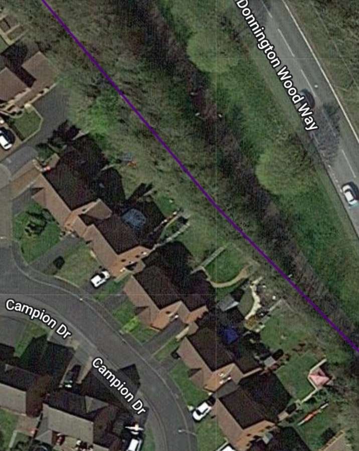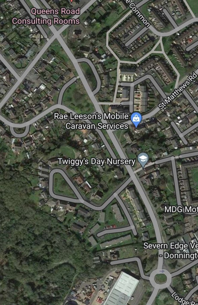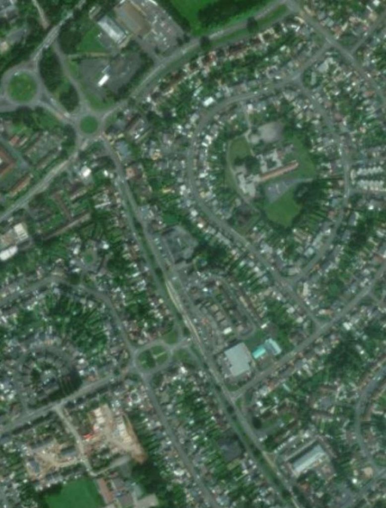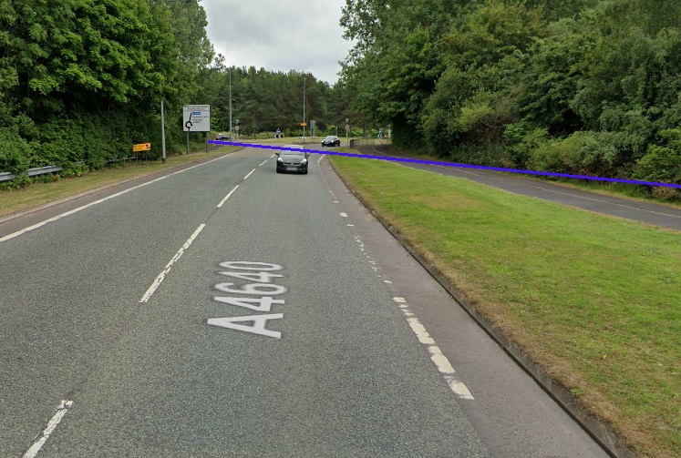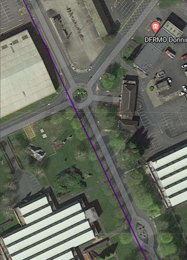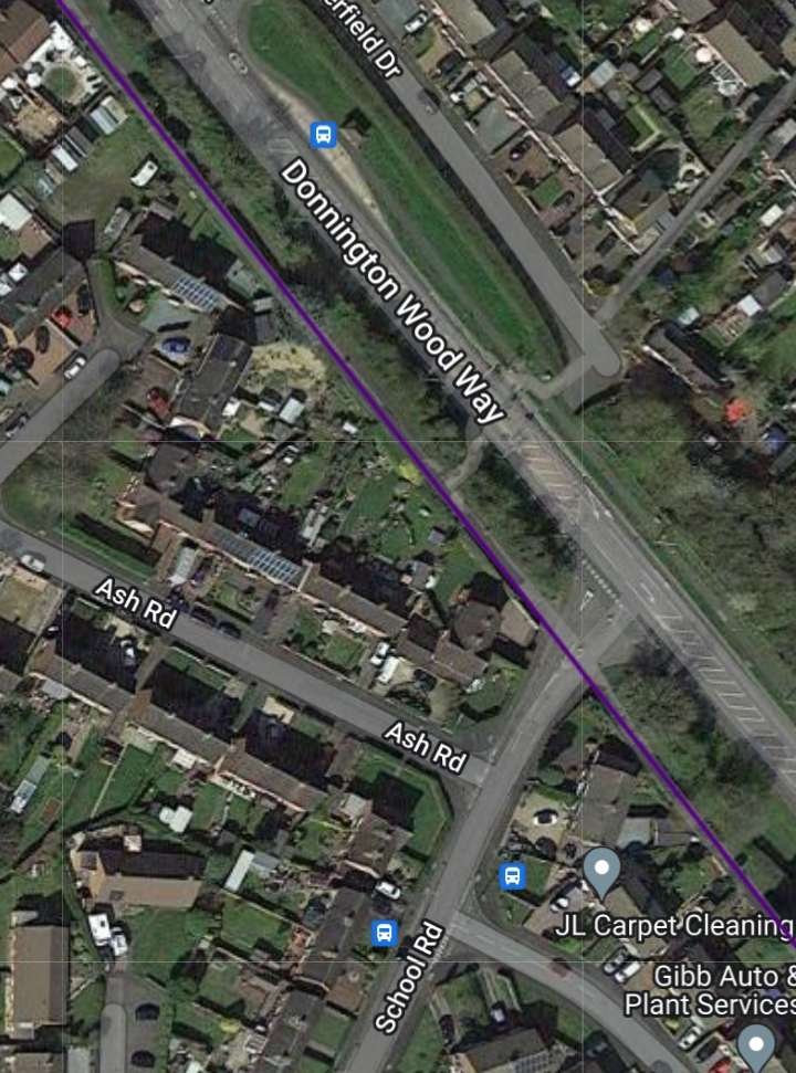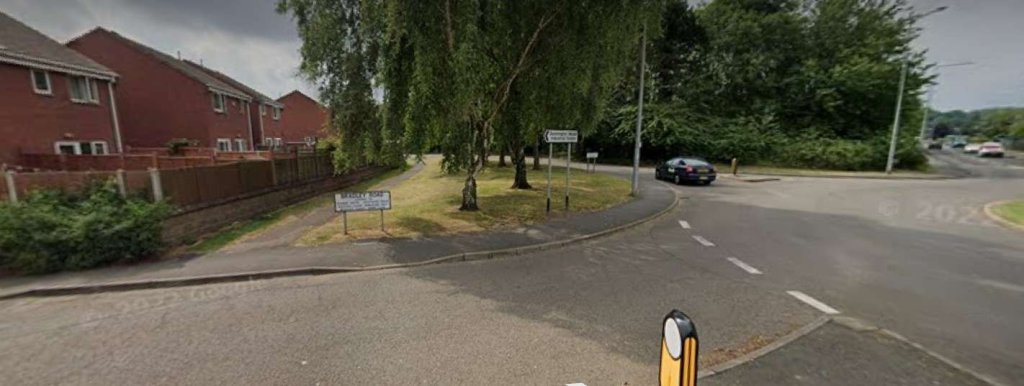 This satellite image is taken from the ESRI image set supplied by the National Library of Scotland. The road shown running North-northwest to South-southeast across the centre of the image follows the formation of the old tramway/railway. In the bottom right of the image a bridge carries the modern A518 over the road just mentioned. That bridge and the A518 are on the line of the old LNWR mainline through Donnington. The bridge is at the same location as the bridge carrying the LNWR line over the tramway/mineral railway. [8]At the same scale as the satellite image above, this ESRI image shows the road with continues to follow the route of the old tramway. The later mineral railway turned away to the East in the top left of this image, rising to run alongside the old LNWR mainline. The smaller of the two roundabouts was built over the line of the old tramway. The road running South-southeast from the roundabout is Wrekin Drive which was also built over the line of the old tramway. [9]Looking South-southeast across the smaller of the two roundabouts mentioned above. Wrekin Drive is the road directly ahead of the camera and it follows the line of the old tramway. [Google Streetview, June 2022]