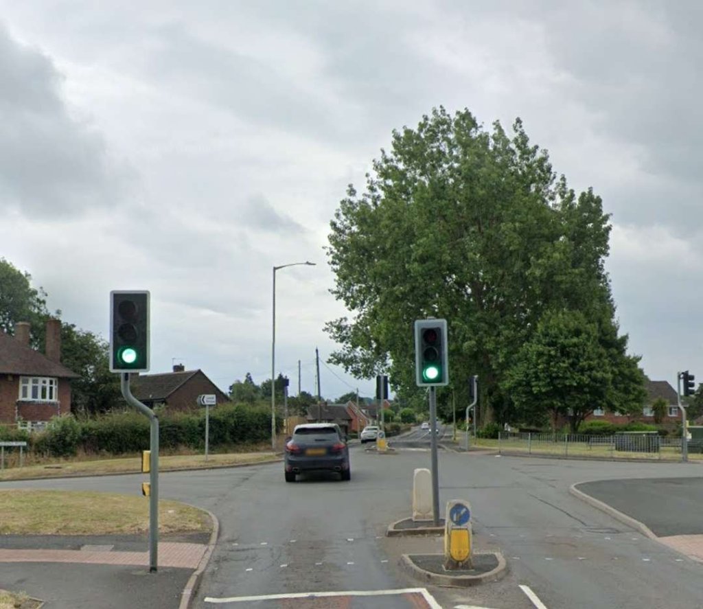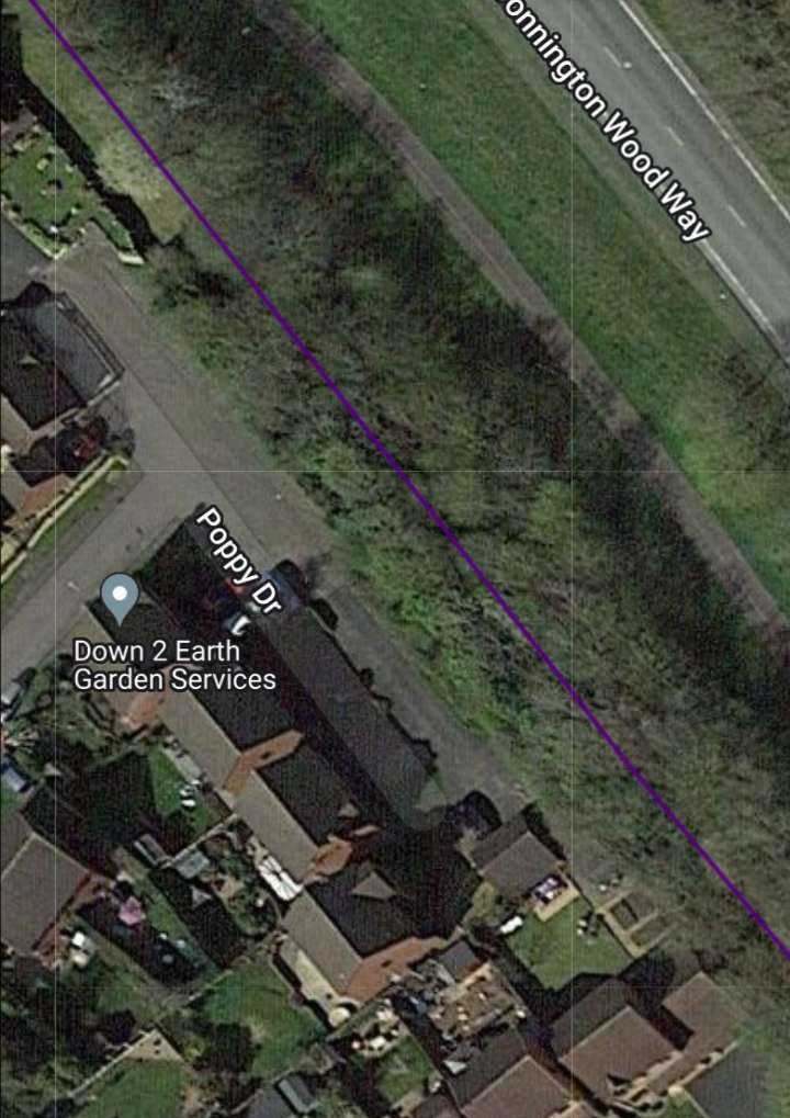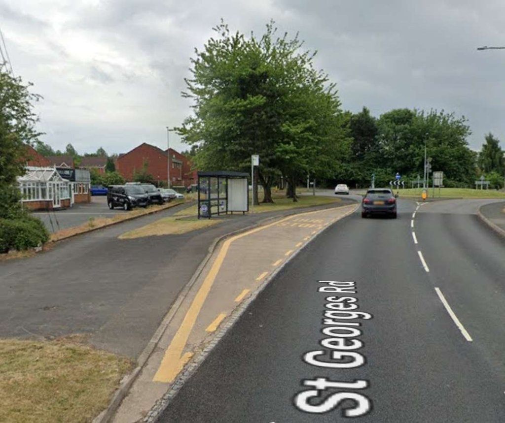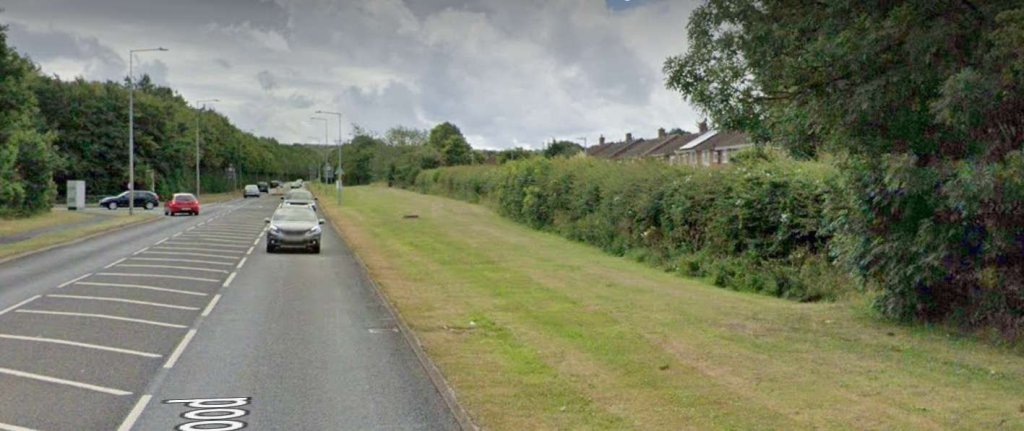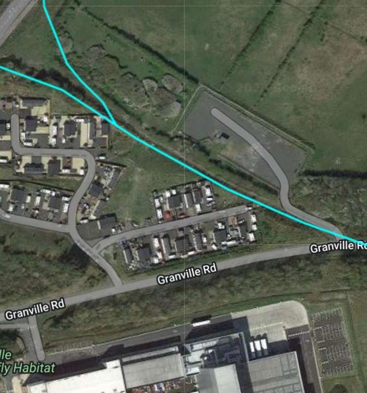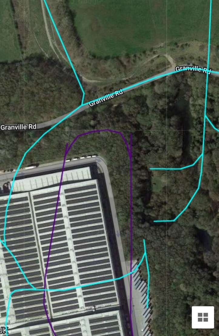 This satellite image is taken from the ESRI image set supplied by the National Library of Scotland. The road shown running North-northwest to South-southeast across the centre of the image follows the formation of the old tramway/railway. In the bottom right of the image a bridge carries the modern A518 over the road just mentioned. That bridge and the A518 are on the line of the old LNWR mainline through Donnington. The bridge is at the same location as the bridge carrying the LNWR line over the tramway/mineral railway. [8]At the same scale as the satellite image above, this ESRI image shows the road with continues to follow the route of the old tramway. The later mineral railway turned away to the East in the top left of this image, rising to run alongside the old LNWR mainline. The smaller of the two roundabouts was built over the line of the old tramway. The road running South-southeast from the roundabout is Wrekin Drive which was also built over the line of the old tramway. [9]Looking South-southeast across the smaller of the two roundabouts mentioned above. Wrekin Drive is the road directly ahead of the camera and it follows the line of the old tramway. [Google Streetview, June 2022]