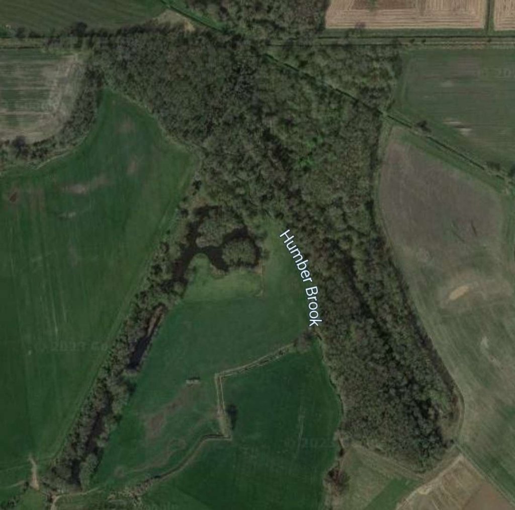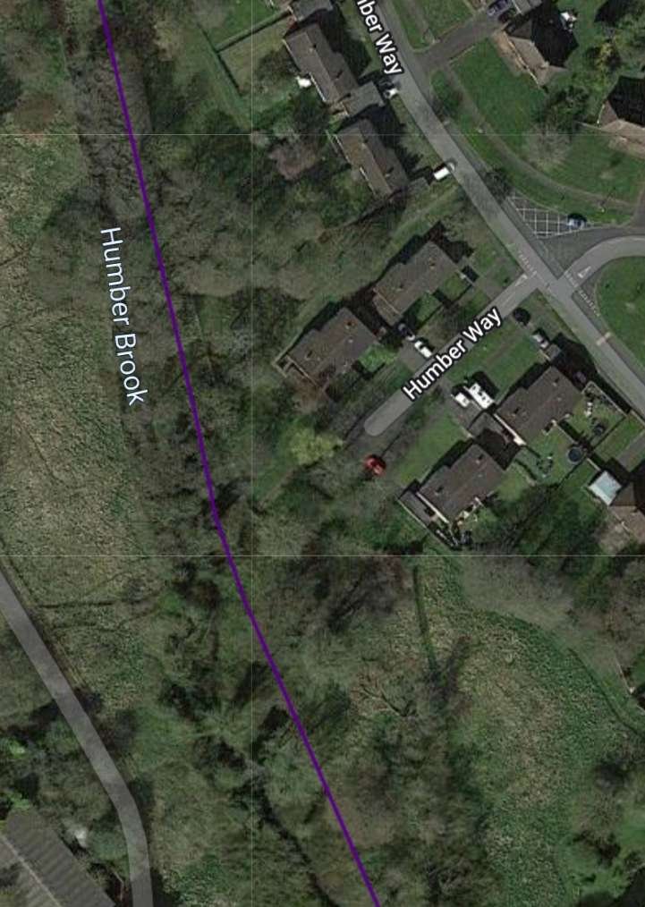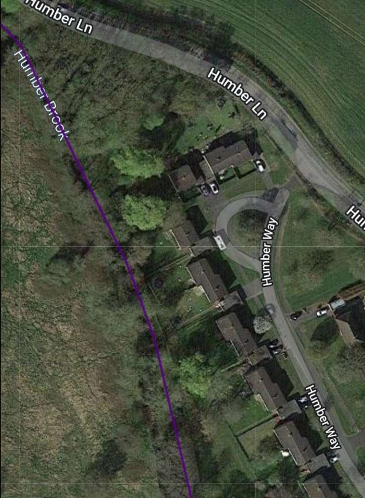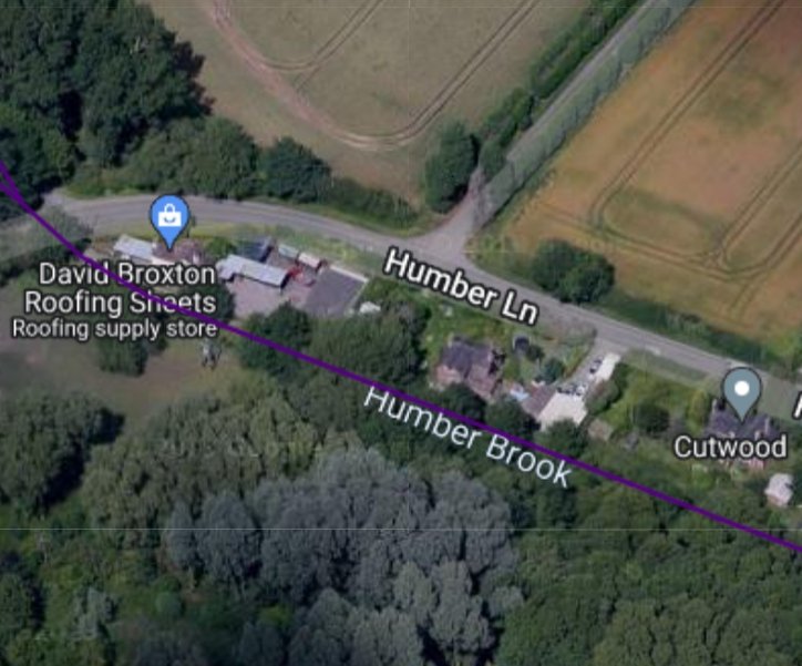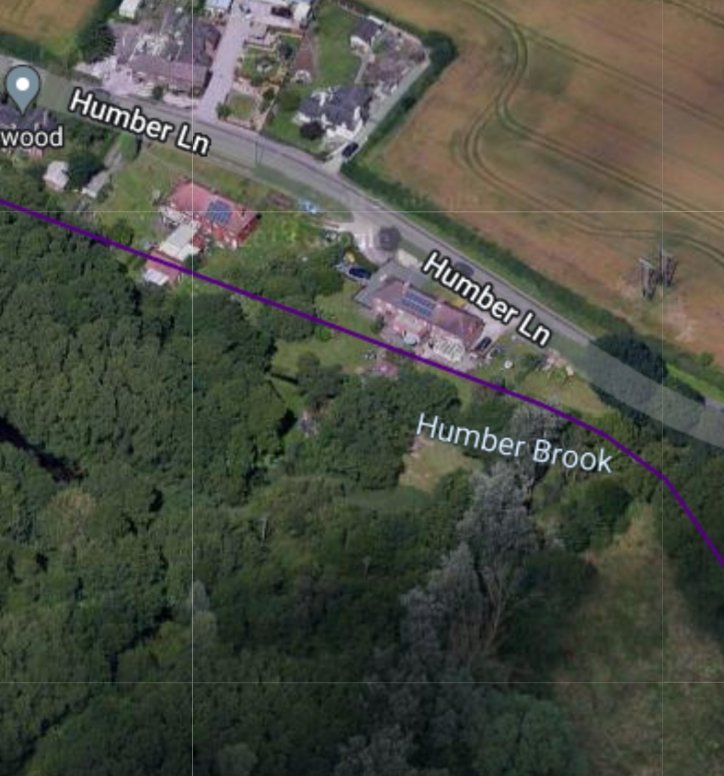 Tree growth patterns highlight both the line of the Humber Arm and the Shropshire Union Canal Newport Branch. [Google Maps, July 2023]