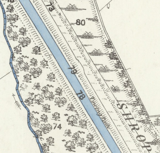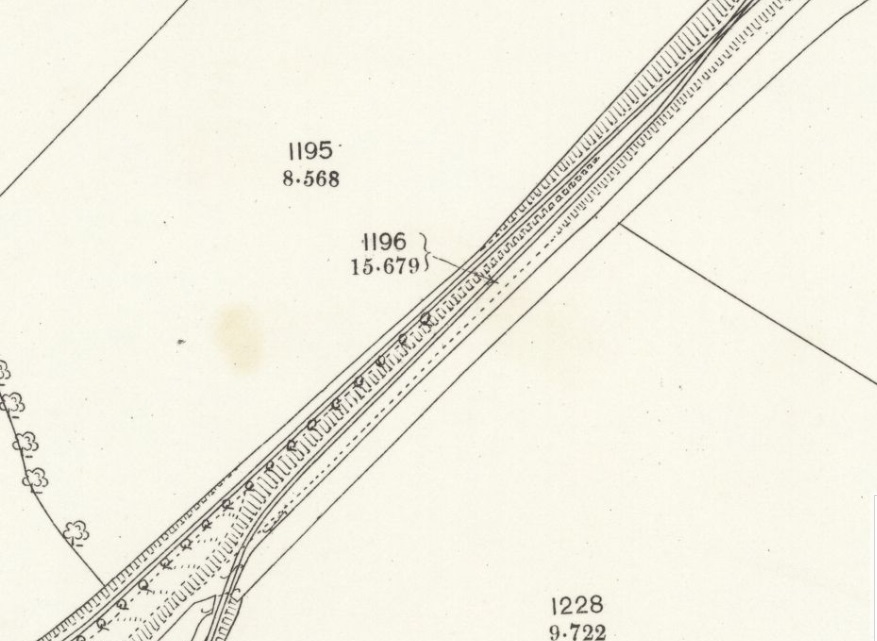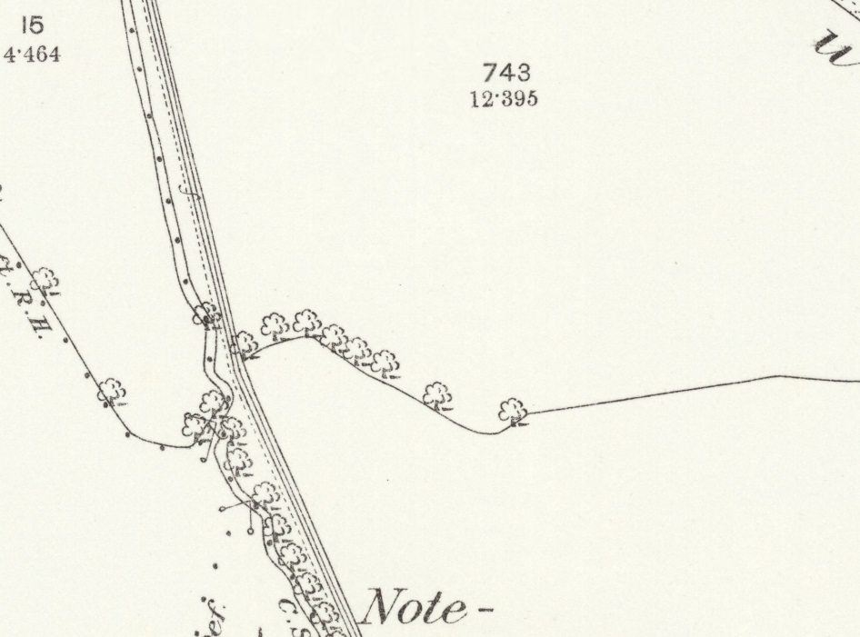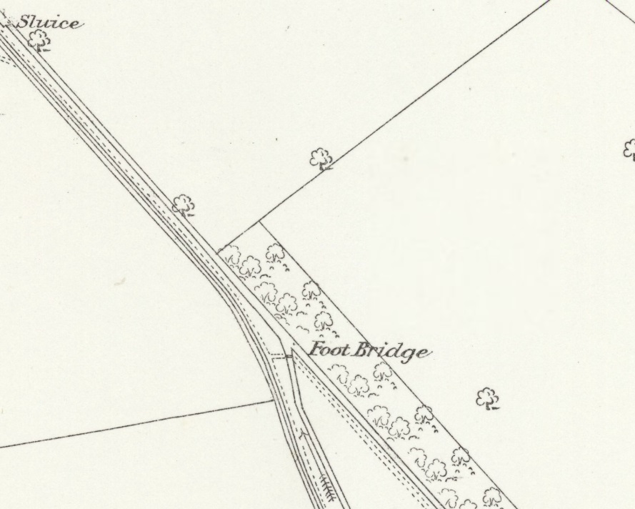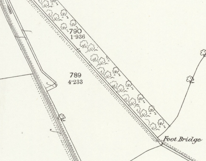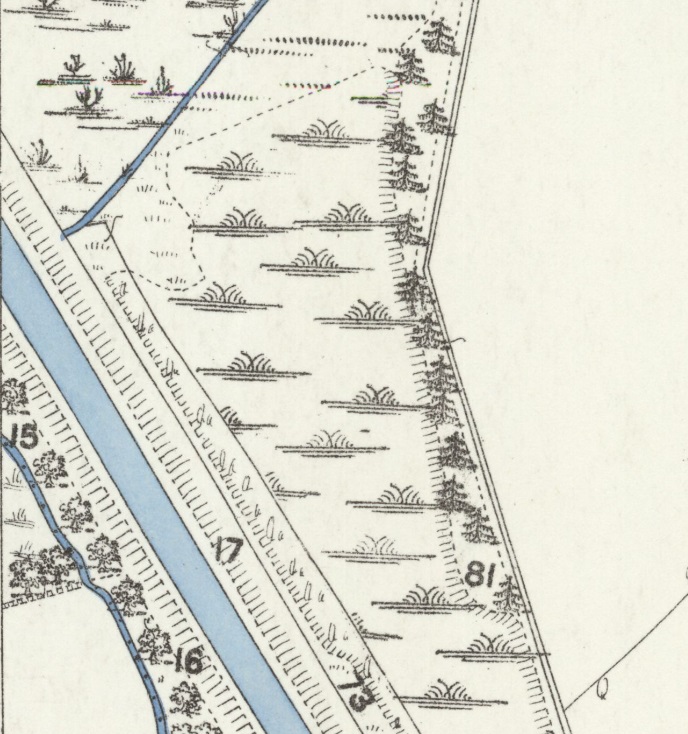 The junction of the Shropshire Union Canal Newport Branch and the Humber Arm which was just a few tens of metres to the South of the aqueduct shown above. The junction was to the East of Kynnersley. The Humber Arm heads Southeast from the Newport Branch. very little changed at this location from the opening to the closing of the Humber Arm. This map comes from the 1901 25″ Ordnance Survey. The following three images are extracts from the next sheet from the Ordnance Survey of 1881.[4]Three successive map extracts cover the length of the Humber Branch (Humber Arm of the Shropshire Union Canal) which appears to the bottom left of the relevant 1881 Ordnance Survey sheet. [5]The remainder of the Canal Arm is on the next 25″ Ordnance Survey sheet to the South which was published in 1882. This length brings the canal to the North end of Lubstree Wharf. [6]The Canal Wharf at Lubstree. 25″ Ordnance Survey of 1882. [6]Approximately the same area as shown on the last map extract above as it appears on the RailMapOnline.com satellite imagery. The purple lines are the approximate line of the Mineral Railway that replaced the tramway we will following first. Satellite imagery shows nothing of the Canal Arm to the North of this image. Heading to the North from here, the line if the canal traverses open fields and then Aqueduct plantation. The trees in the plantation obscure any direct evidence of the old canal arm from above and, similarly, the location of its junction with the Shropshire Union Canal Newport Branch. [10]