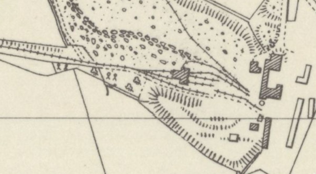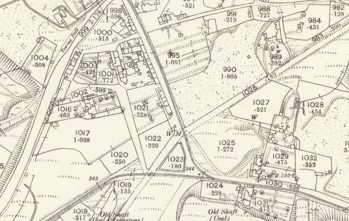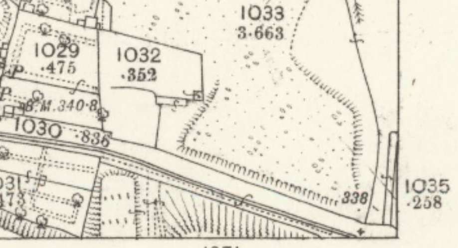 South of this point the old tramway continued in a South-southeasterly direction. It crossed what became Wellington Road as can be seen below on the next extract from the 1881/1882 25″ Ordnance Survey. As can also be seen on the map extract, South of the road the old tramway formation was by 1882 being used as a road/track. Which ultimately became Wrekin Drive.