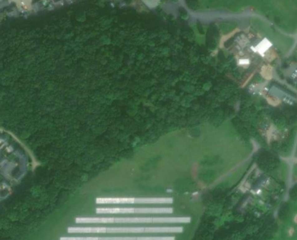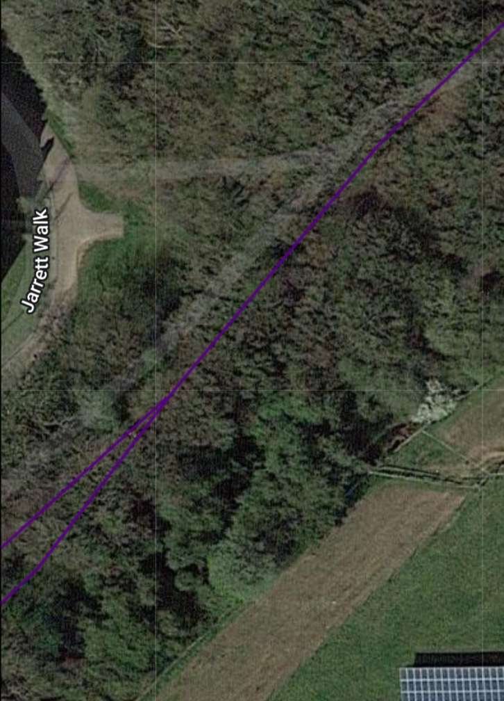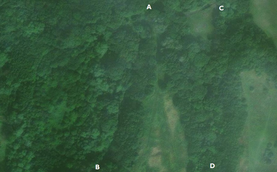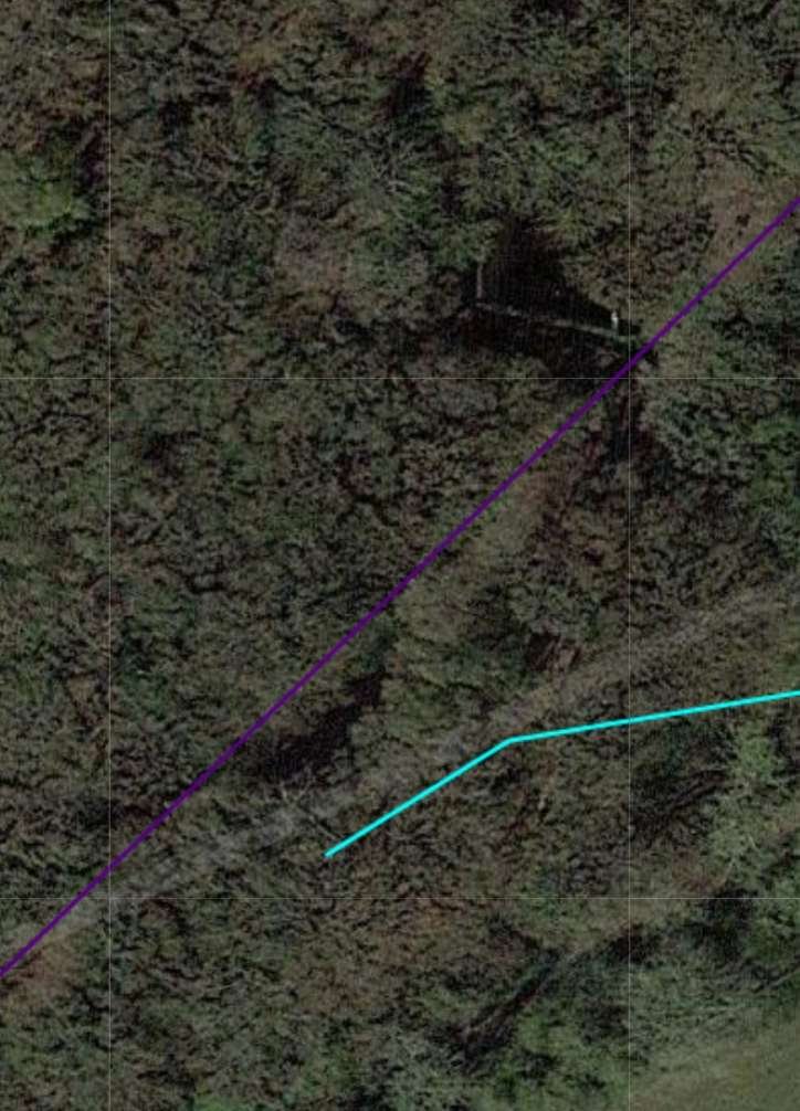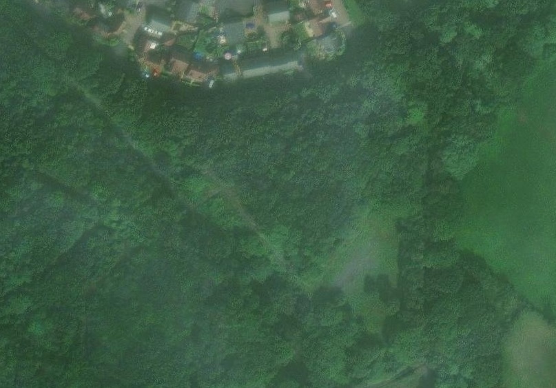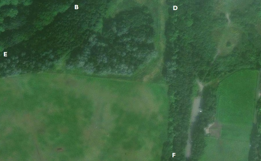 While it is true that direct evidence of canal remains cannot be seen, tree growth differs along the line of the two old canals as this next satellite image from Google Maps shows.