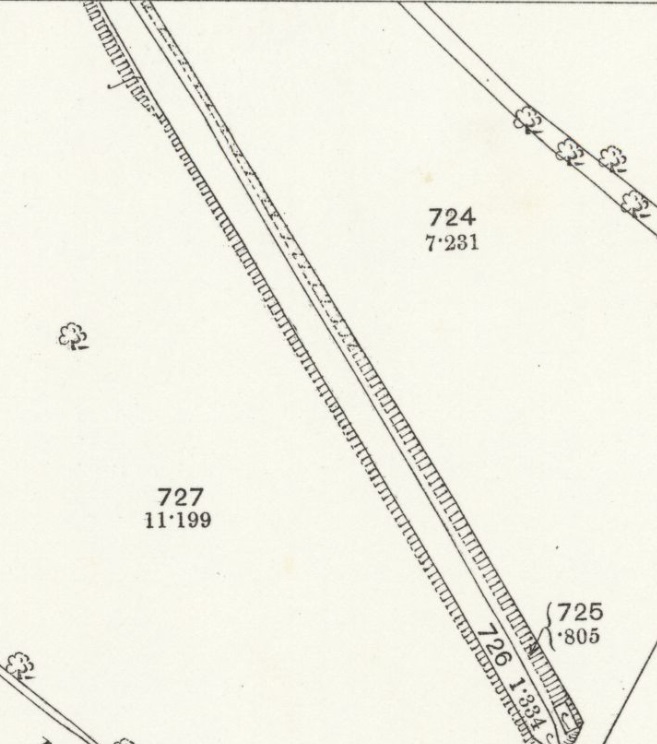 This image is a further extract from the 25″ 1881/1882 Ordnance Survey. It shows the route of the old tramway crossing what became Wellington Road and continuing along what became Wrekin Drive. [7]