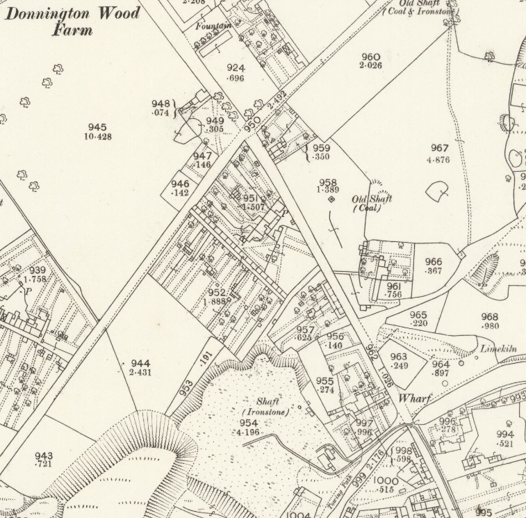 The on-going tramway route is followed on the 25″ Map extracts below but as a smaller scale than the images above. It passed Donnington Wood Farm and crossed Queens Road and then following the route of what became St.George’s Road it crossed the Donnington Wood Canal. At this point the map extract shows that the tramway tracks remained in place to serve an old ironstone mine/shaft.
