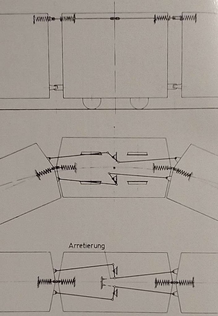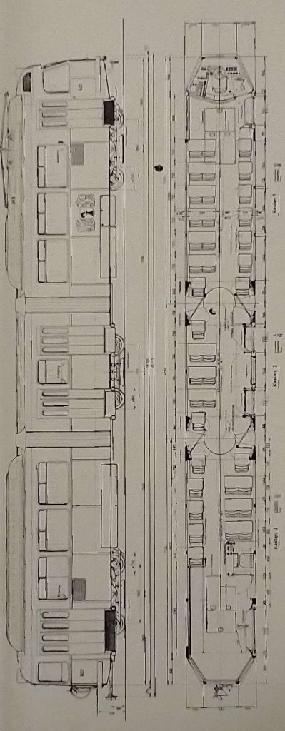 “This … led to a unified effort by the Basel and Zürich undertakings, the two largest tram- ways in Switzerland, to design an articulated car whose basic design was suitable for both undertakings. Whilst a classical (by German standards) two-section single-articulated six-axle car was built for Zürich by SWS (Schlieren), the co-operation between the two systems to find the most advantageous design resulted in an order for three articulated cars, two for the BVB (Basel) and one for the VBZ (Zurich), being placed with SIG (Neuhausen). SIG conceived a new style of construction, departing from the customary articulation over the central bogie (known as a Jacobs bogie) in favour of a short middle section on a two-axle non-rigid truck with an articulation at each end.