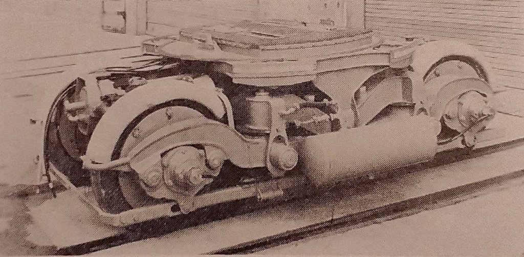 “The motor trucks are swing-link trucks with outside frames and torsion-bar springing. The springing of the torsion bar and the swing-links is combined into a single springing system, and this contributes considerably to noise reduction, in conjunction with the resilient wheels. The longitudinally-mounted motors are held by a three-point suspension to the truck frames, using rubber inserts.