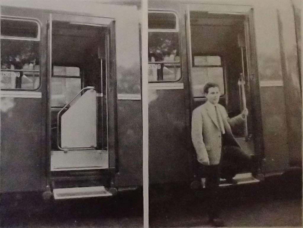 “The exit doors incorporate a device similar to that on the Stuttgart articulated cars. They are operated by the passengers through a push-button, and the opening of a light inner door by the passenger in order to gain access to the step holds the main doors open. The other function of the inner door is to prevent the entry of passengers at the exit doors. In Zürich, passengers would press the push-button to signal to the conductor to open the doors, whilst Basel had intended that passengers should open the doors themselves. However, as Basel experienced some confusion with this arrangement, they changed over to the Zürich system.