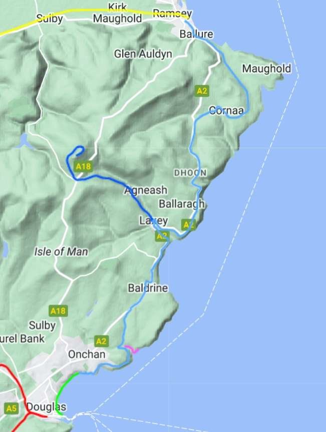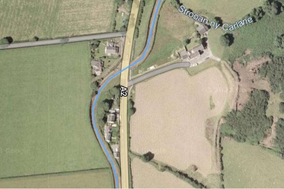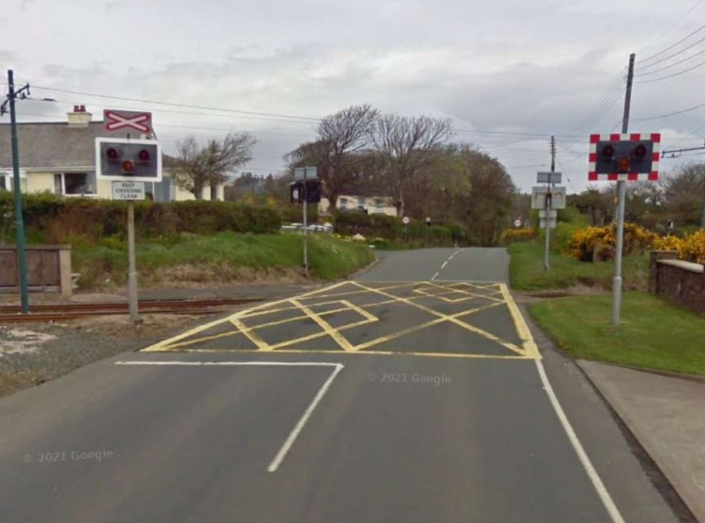 The road crossing closest to Douglas is at the top-right of this extract from RailMapOnline. [5]The view North-northeast along the A2 at the above crossing. [Google Streetview, October 2010]The road crossing closer to Laxey. [5]The view North along the A2 at the crossing above. [Google Streetview, October 2010]