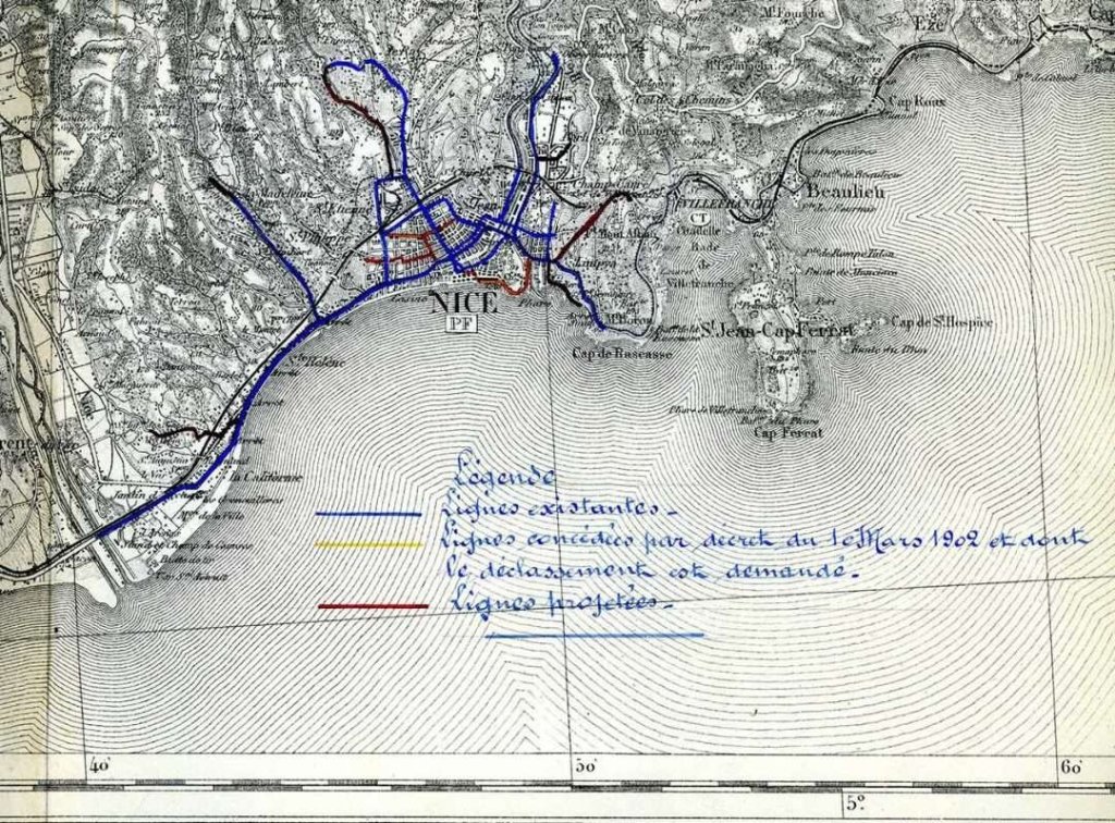 Held in Nice Archive Library, this is a map of the tram network (cartes du reseau des tramways), in the early 20th century. Archives Nice Côte d’Azur, 2 O 3. [3]