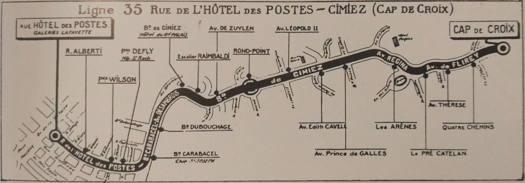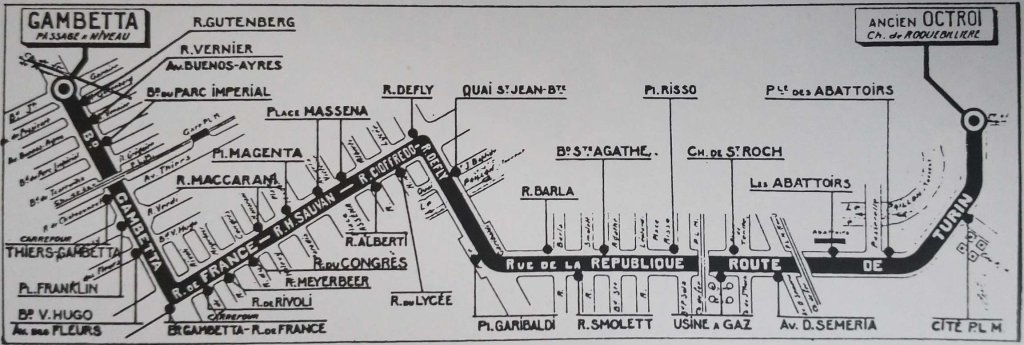That length of this route was shared with the interurban lines to Cagnes and Antibes, and with other urban routes: the one towards the Passage-à-Niveau branched off onto Boulevard Gambetta, while the line from La Madeleine branched off at Pont-Magnan.
