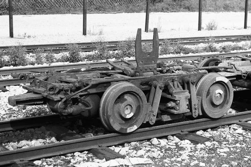 Photograph 6: A second plate-frame trailer bogie brought up on to the running line, derailed with crow-bars, and pushed across the tarmac to the three-rail siding.