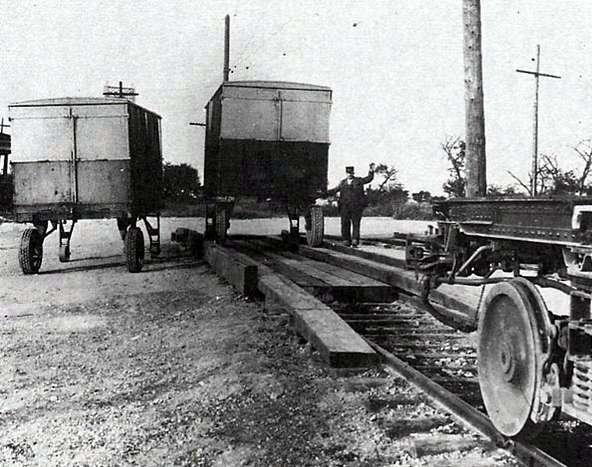 Photograph 4: “The trailer bogie is run in under the car, and the body lowered and traversed sideways on to the bogie centre-plate, then secured by a king-pin and side chains.” [1: p20]