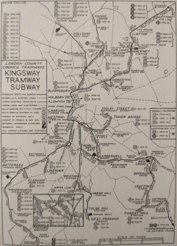 Service 33 was altered twice during 1931 and began operating in off-peak hours, being diverted first to Norwood on 14th May, and then at the other end to Manor House on 8th October, after which it remained unchanged. Also on 14th May, 1931, 35 was extended to Forest Hill (Cranston Road) via Brockley, the indicators actually showing Brockley Rise. A Saturday evening and Sunday working was instituted between Highgate and Downham via Brockley – 16 miles the longest tram service ever operated entirely inside the County of London. The dates of this service are uncertain, but it was definitely working on 8th October, 1931. It possibly ceased after 5th March, 1932, on which date the southern terminus of 35 became the lay-by at Forest Hill Station. On 30th June, 1932, the route was diverted via Walworth Road instead of via Kennington and thereafter remained unchanged. On 1st June, 1933, short workings were introduced between Highbury and Elephant and Castle via St. Georges Road. These were numbered 35A.” [1: p390-392]