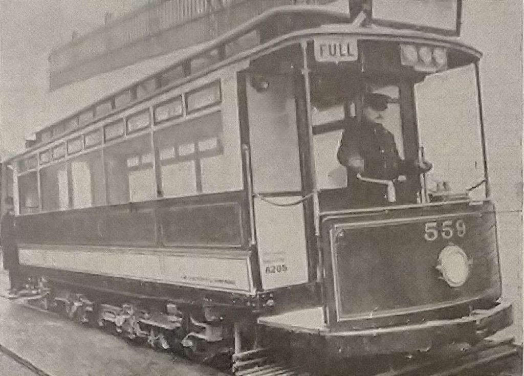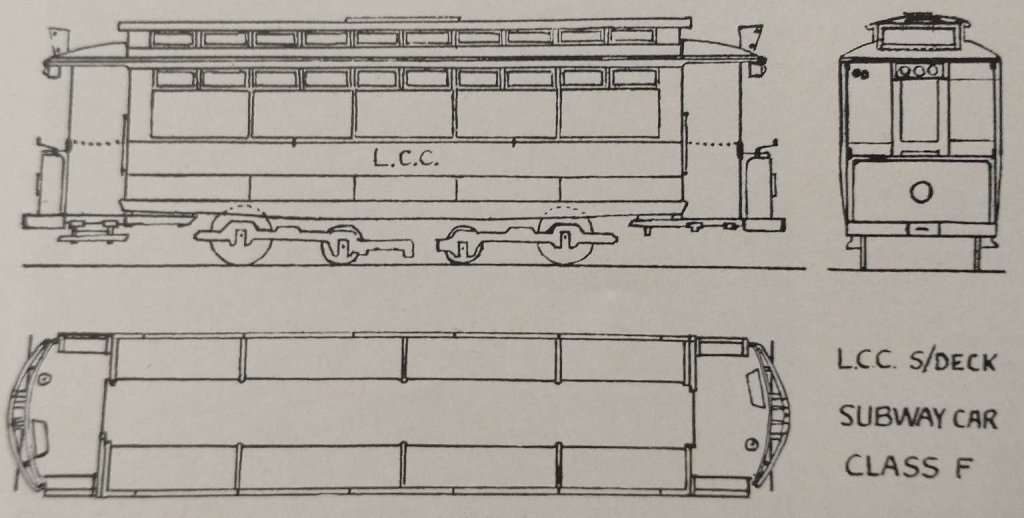 Sixteen Class F tramcars (numbered 552 to 567) were ordered from the United Electric Car Company, Limited, Preston at £750 each. The Board of Trade, then the Government Department concerned with tramways, was very focussed on the risk of fire in the tunnels and the new cars had to be as non-flammable as possible. “The underframes were therefore made of steel angle and channel sections, and the body panels were of sheet steel. The slatted longitudinal seats were of non-flammable Pantasote on angle steel supports; the seating capacity of the cars was 36. Even the adjustable spring roller-blinds, with which the windows were fitted, were supposed to be non-flammable. The inside finish was entirely in aluminium. The cars were 33 ft. 6 in. long over the fenders and 24 ft. 10 in. over the body pillars. The trucks were centre bearing maximum traction bogies by Mountain and Gibson with a 4 ft. 6 in. wheelbase and 311 in diameter driving wheels. The distance between the centre of the driving axles was 14 ft. 6 in. The controllers were by Dick Kerr and included provision for using the electro-magnetic brake for service stops.” [1: p387]
