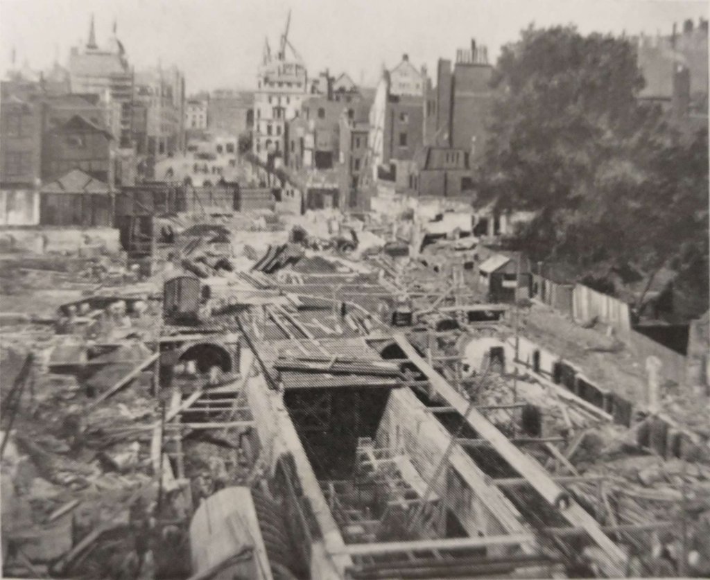 The former tramway subway ran beneath Aldwych and Kingsway. “When the London County Council, as the tramway authority for the Metropolis, decided that it would itself operate the services as the various leases fell in, the question of joining up the separate company systems became very important, particularly with a view to giving communication between the north and south sides of the river. The decision to clear an insanitary area in Holborn, and to construct Aldwych and Kingsway, led to discussion in 1898 on the possibility of using the new streets for a tramway to connect the northern and southern systems. It was then suggested that instead of running the trams on the streets, a sub-surface line should be constructed as an integral part of the improvement. Something similar had already been done in New York and Boston, and a deputation … was, therefore sent to those places.” [1: p385]