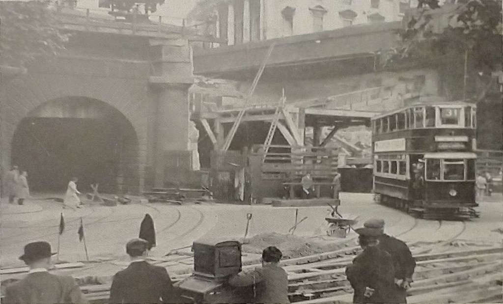 To provide a northern connection with the subway, it was decided to electrify the line in Theobalds Road (by arrangement with the North Metropolitan Tramways Company, which then held the lease) and to construct a new line in Rosebery Avenue and St. John’s Street to the Angel, Islington. The estimate for this was £40,500, but owing to great difficulties with sub-surface mains and other obstructions the cost eventually reached £47,000. Part of the reconstructed roadway was carried on a concealed iron viaduct. Work was started on the reconstruction on 17th September, 1905. The Board of Trade inspected the Subway and the new line to the Angel on 29th December, 1905, and motormen then, began to be trained.” [1: p387]