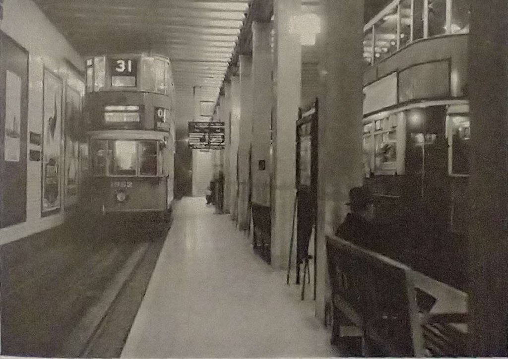 In 1937, the rebuilding of Waterloo Bridge necessitated the diversion of subway exit to a position centrally beneath the new bridge, at a cost of £70,000 including a new crossing of the District Railway; after the changeover took place, on 21st November, 1937, the curved section of tunnel leading to the former exit in the bridge abutment was walled off and still exists. For the next three years, the trams entered the subway through the bare steelwork, as the new bridge took shape above their heads. In anticipation of a general con- version of the London tramways to trolley- bus working, an experimental trolleybus (No. 1379) placed in service on 12th June 1939, was so designed as to permit passengers to board and alight from the offside at Aldwych and Holborn Stations. Not until some years later did London Transport admit officially that this experiment had been a failure.” [1: p394]