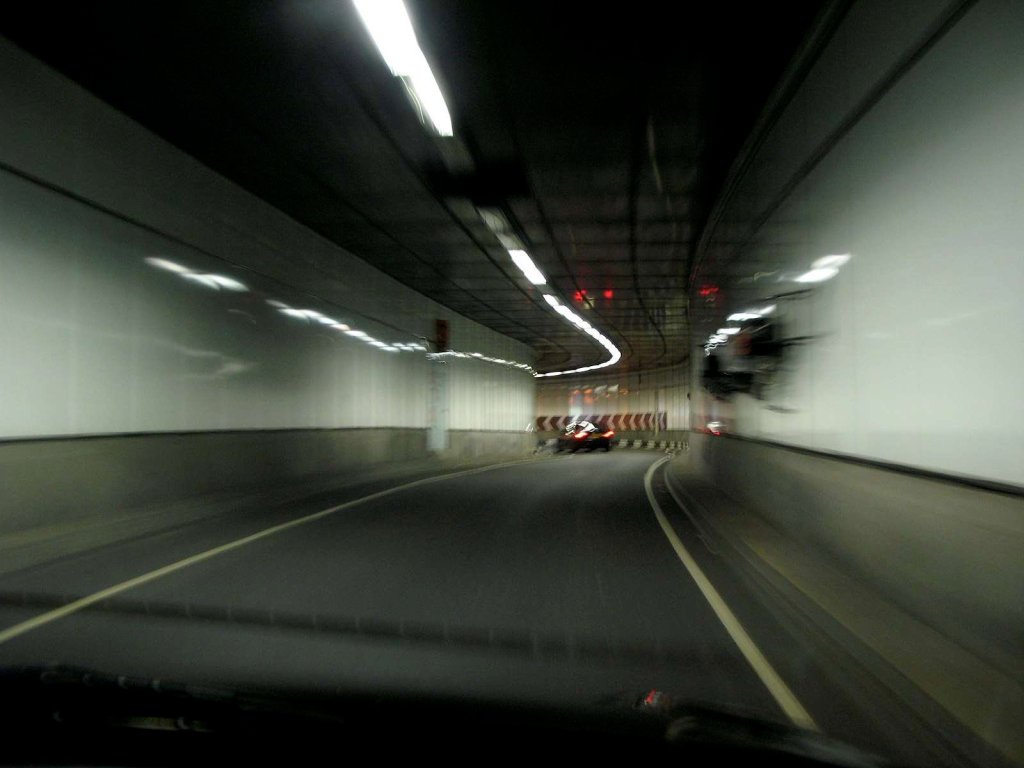 The new underpass opened on 21 January 1964. “It is only 17 feet (5.2 m) wide and, as a result, it is normally one-way northbound because of the side clearances required. The headroom is only 12.5 feet (3.8 m) due to the tunnel having to pass beneath [a] bridge abutment by a 1:12 gradient. An electronic ‘eye’ alerts drivers of tall vehicles and diverts them to an ‘escape route’ to the left of the entrance. However, high vehicles do still try to pass through and so get stuck occasionally.” [5]