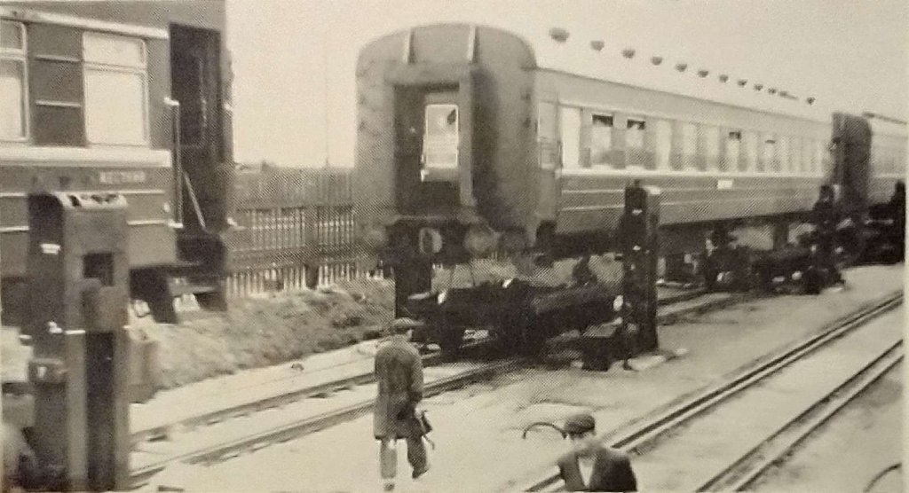 In the early 1950s, Price tells us, “A considerable stir was caused in railway circles by the news that the Russian and Czech railways had introduced a service of through sleeping-cars between Prague and Moscow, overcoming the break of gauge at the Russian frontier. It appeared that the cars could be lifted on jacks, complete with their passengers, while the standard-gauge bogies were run out and replaced by others of the wider Russian gauge. This method was later extended to other routes, and the accompanying photograph, taken in 1957, shows the cars of the Moscow-Berlin Express raised up on electric jacks in the gauge-conversion yard at Brest-Litovsk, on the frontier of Russia and Poland. … Unknown to the Ministry of Communications of the U.S.S.R., something very similar has been going on quite unobtrusively here in these islands, not just in the last decade, but ever since 1933. The place is Laxey, Isle of Man, and the cause is the six-inch difference in gauge between the Manx Electric Railway’s Douglas-Ramsey line and the Snaefell Mountain Railway. The coastal tramway was constructed to the usual Manx gauge of 3 ft. 0 in., but on the Snaefell line this would not have left sufficient room for the centre rail and the gripper wheels and brake-gear, with the result that the mountain line uses a gauge of 3 ft. 6 in. instead.” [1: p19]