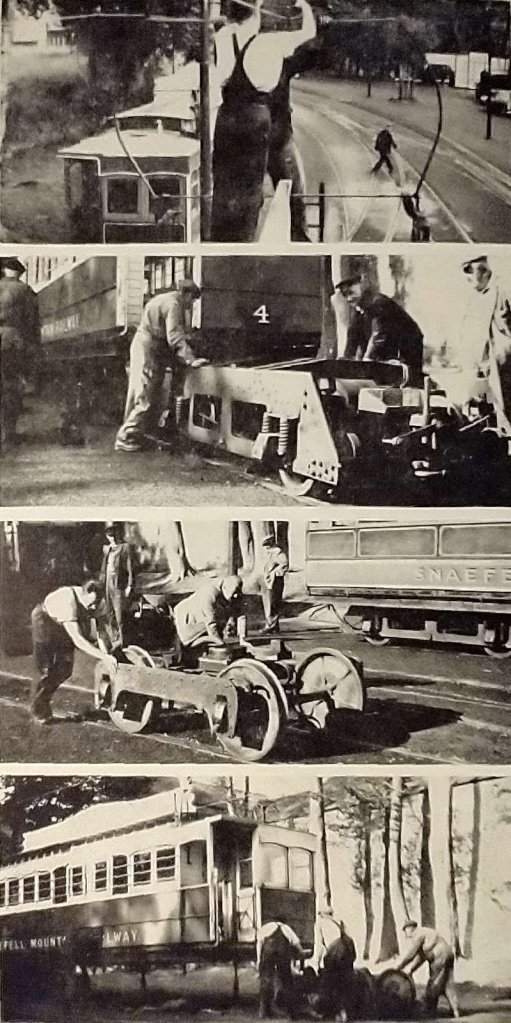 The result of this decision was that every now and again (once or twice a year) a Snaefell car had to be lifted off its 3 ft. 6 in. gauge trucks and mounted on 3 ft. gauge bogies to be towed down to Douglas, returning by the same means when its overhaul was completed. This operation was rarely seen by visitors to the Isle of Man as it took place out-of-season.