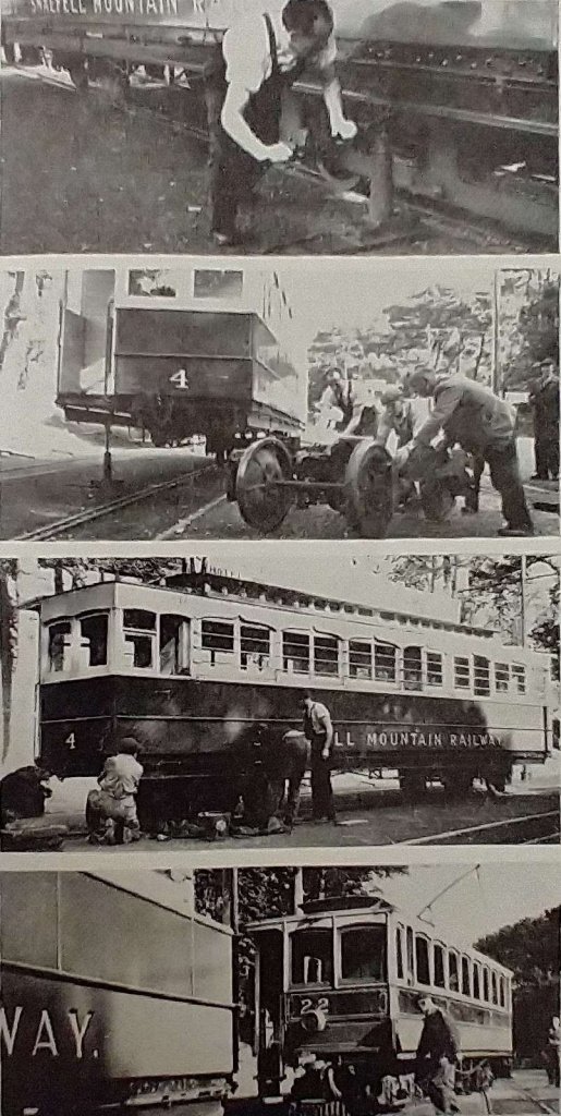 Both the MER and the Snaefell lines “have always been under a common management, and in past years, repainting of Snaefell cars was carried out at the mountain line’s car shed by staff who travelled up each day from Derby Castle. Since Snaefell car shed at Laxey is narrow and rather dark, the work was mostly done out of doors, the car being run in and out of the shed each time it rained. After the 1933 fire at the other Laxey car shed had created a float of spare plate-frame bogies, the management decided to use a pair of these to bring Snaefell cars due for overhaul down to the principal Manx Electric workshops at Derby Castle, Douglas. Controller overhauls and motor repairs were already carried out at Douglas, and since 1933 work at Laxey has therefore been confined to routine maintenance, running repairs and truck overhauls.” [1: p19]
