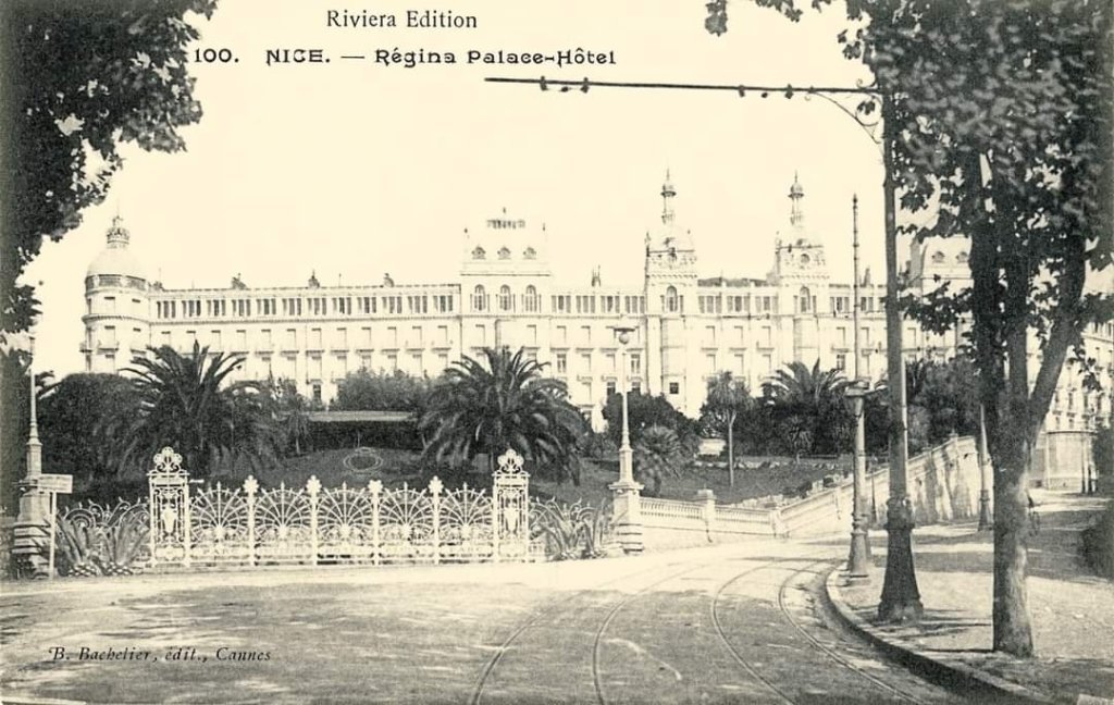 The tram route bears to the right in front of the Regina Palace Hotel. The older horse -drawn tramway turned left at this location. This image was shared on the Comte de Nice et son Histoire Facebook Group on 15th March 2019 by Jean-Paul Bascoul. [5]The same location in 2023. [Google Streetview, April 2023]