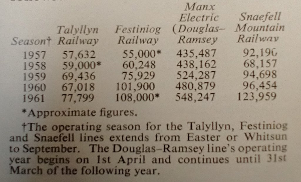 The Journal provided a comparison of passenger numbers on a number of heritage lines on the Isle of Man and in Wales. Their table is reproduced below.