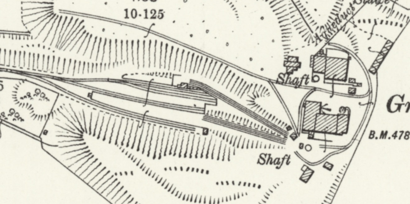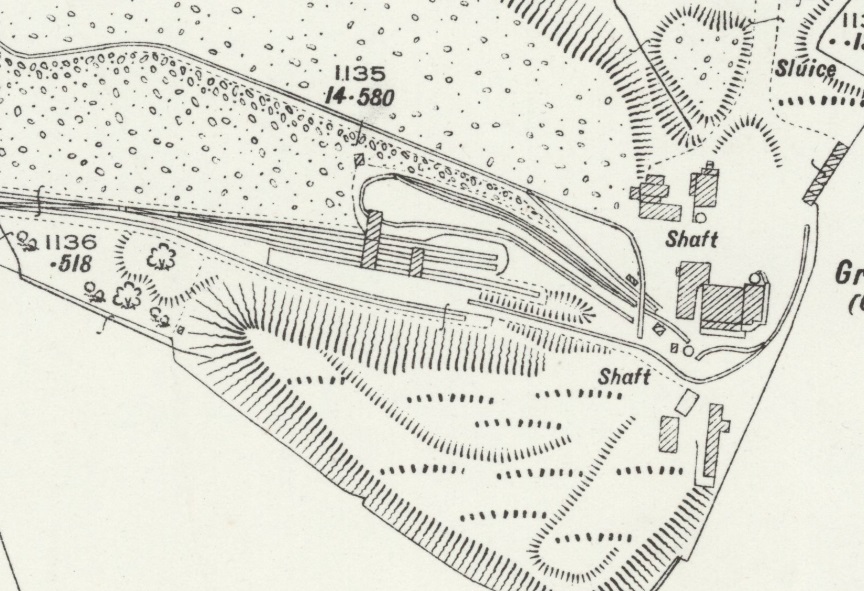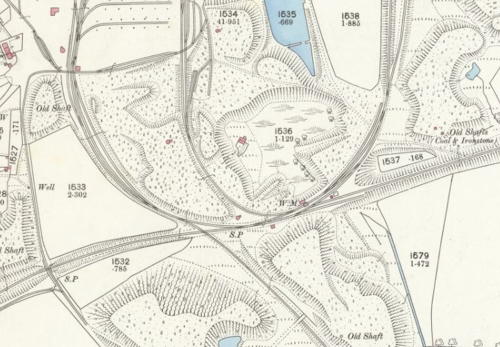 The last map extract above shows the route of the old tramway extending South-southeast from the LNWR mainline with the more modern standard-gauge mineral railway curving round after passing under the mainline and climbing on a gradient of about 1 in 77 to run alongside the LNWR line.