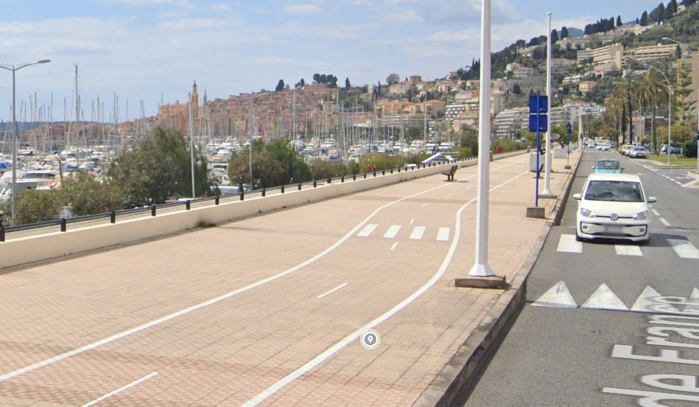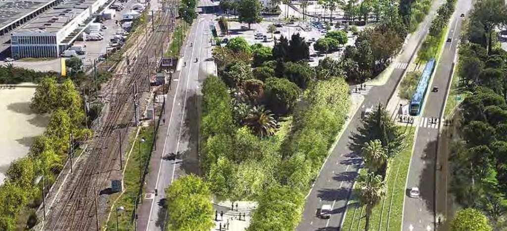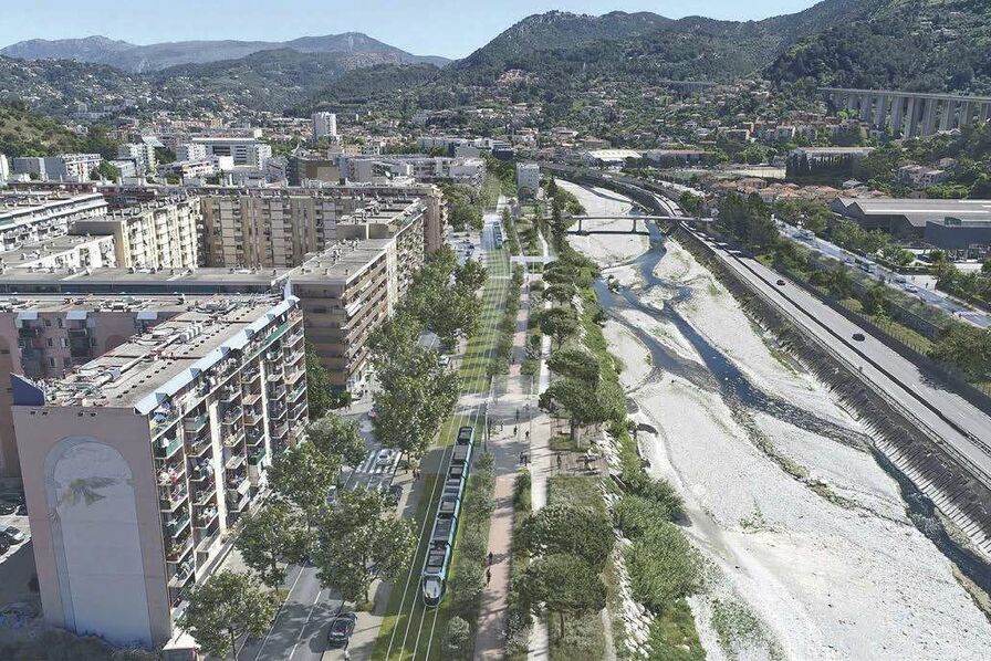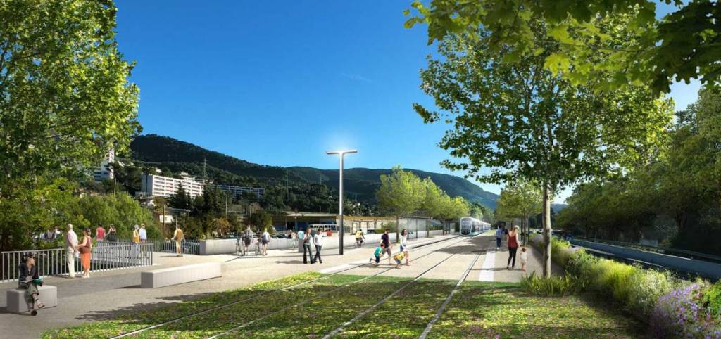 “As part of the creation of this new transport axis, it is planned, in addition to the creation of 7.6 km of additional tramway on predominantly grassed trackway tram platform,, to give more space to pedestrians and bicycles. Thus, a continuous cycle route will be created between Drap and the eastern centre of Nice. More generous pedestrian spaces will be created along this axis to rebalance the city for the benefit of local residents.” [10]