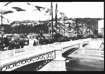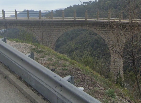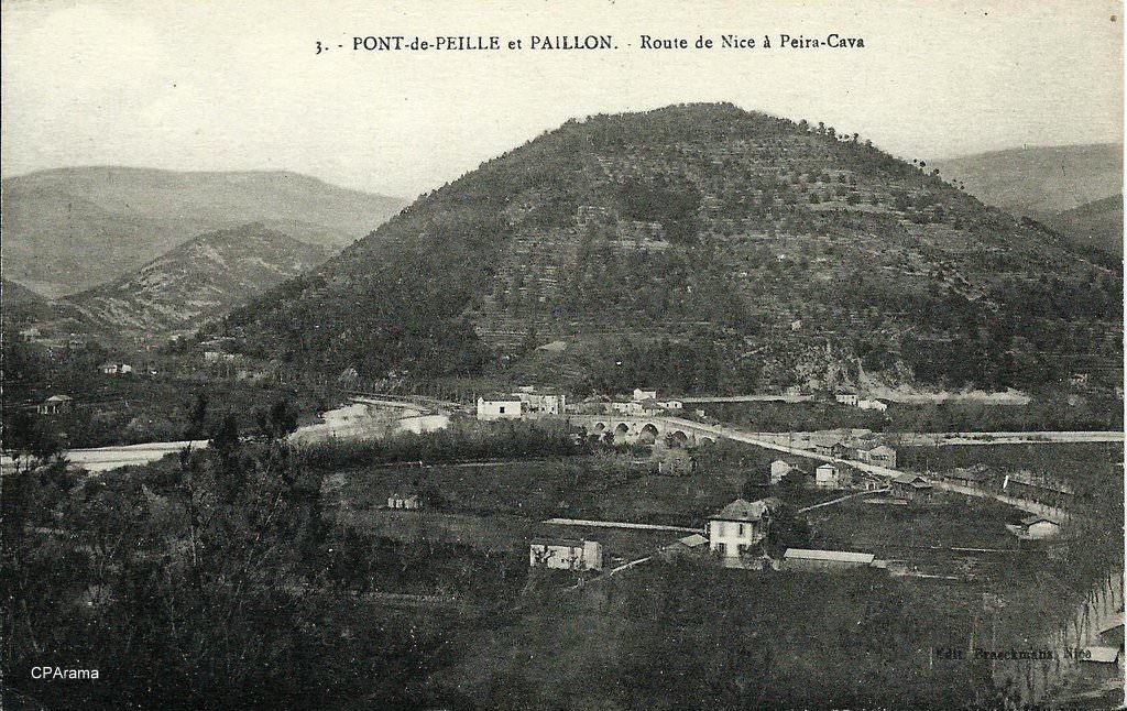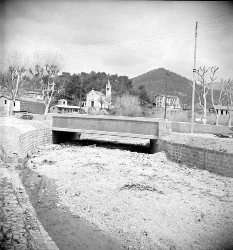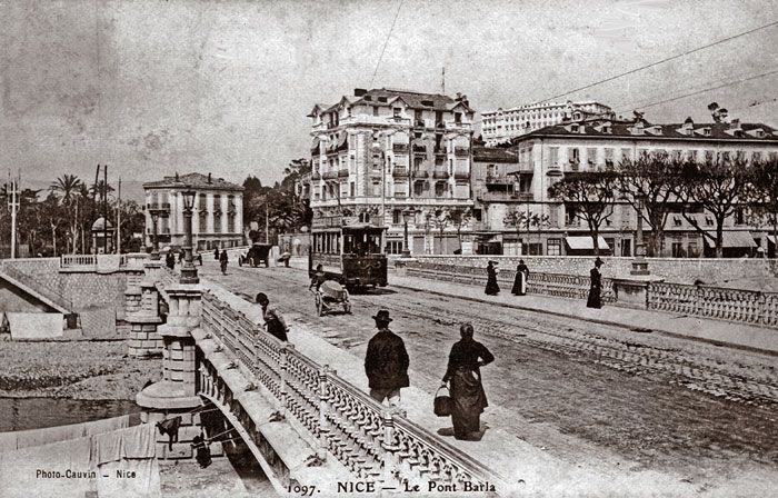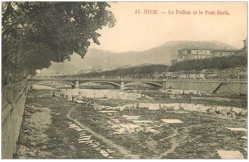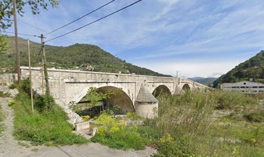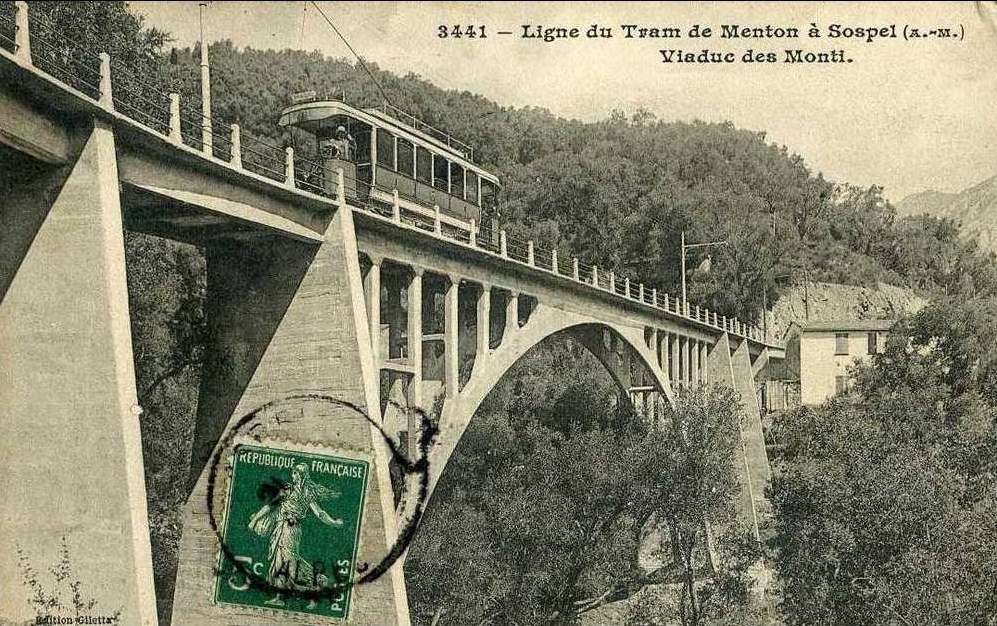 The confluence of two arms of the River Paillon lay shortly beyond the railway bridge (Paillon de Contes and Paillon de L’Escarène). The Paillon de L’Escarène flowed in from the Southeast from the heights of Peillon, L’Escarène and Lucéram. It was spanned by a five-arched viaduct, some 140 metres in length which carried both the Route Nationale and the tramway. The construction of the bridge was started in the last years of the 18th century. While the bridge may well have been completed within a few years, the construction of the road of which it was a part, between Turin and Nice, was interrupted by conflict and was not completed until 1838. [1: p67]
