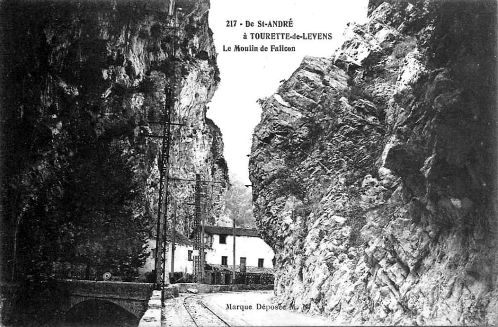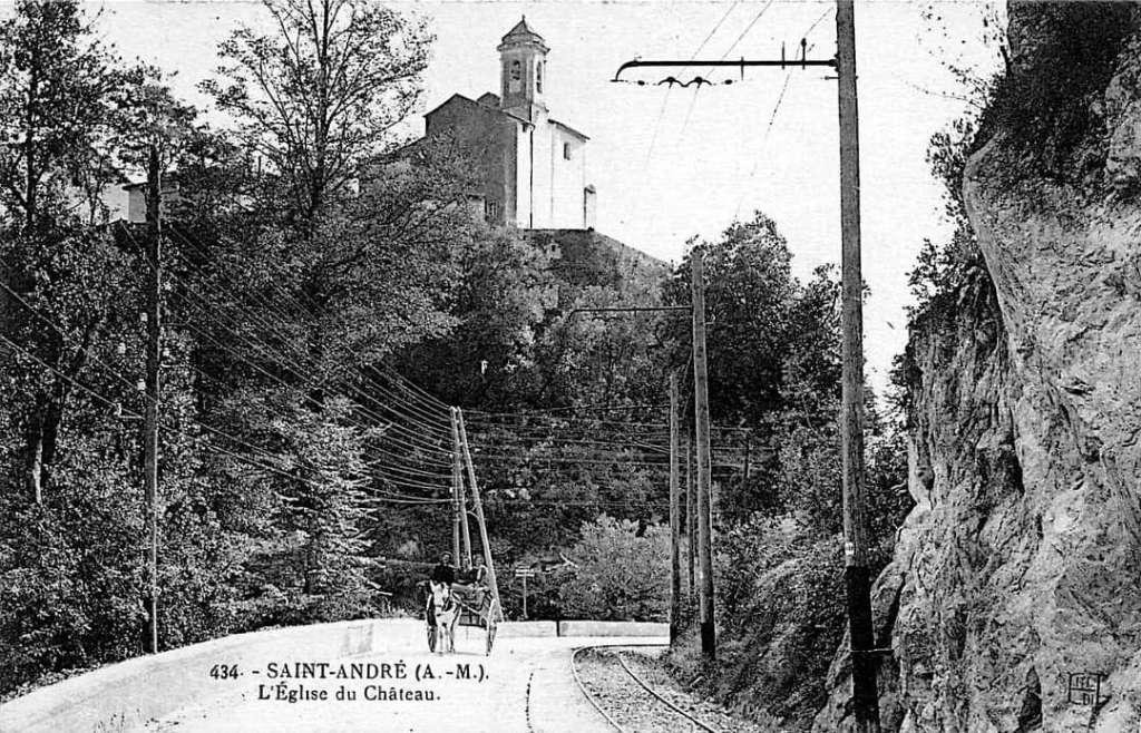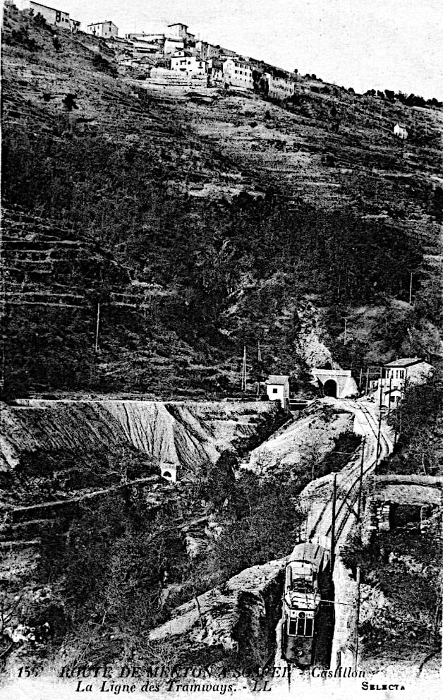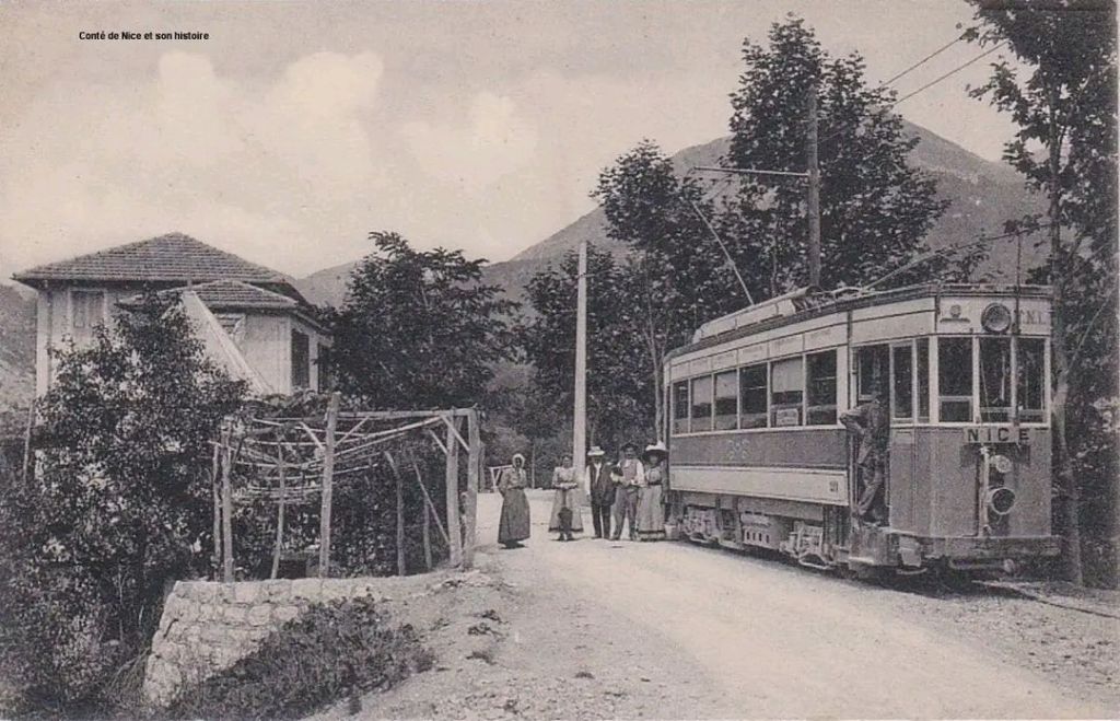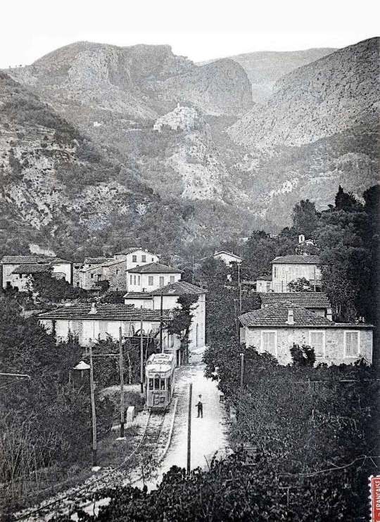 The branch-line followed the valley of the River Paillon de L’Escarène valley, a route also used by the PLM Nice-Cuneo line. Banaudo tells us that “the tram first took the right bank, sometimes on the shoulder and sometimes on the roadway of Route Nationale No. 21 (now departemental road No. 21). It passed through the hamlet of Borghéas, then entered the Châteauvieux gorge where a three-arch bridge brought the road and the track over to the left bank. After passing the pumping station of a spring which supplied part of the city of Nice with drinking water, trams reached the hamlet of Ste. Thecla.” [1: p72]