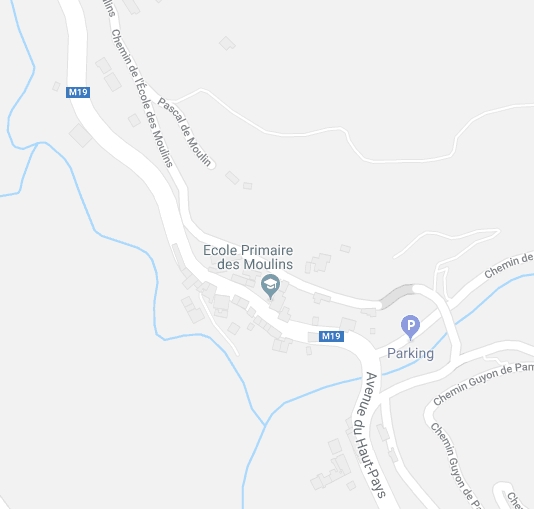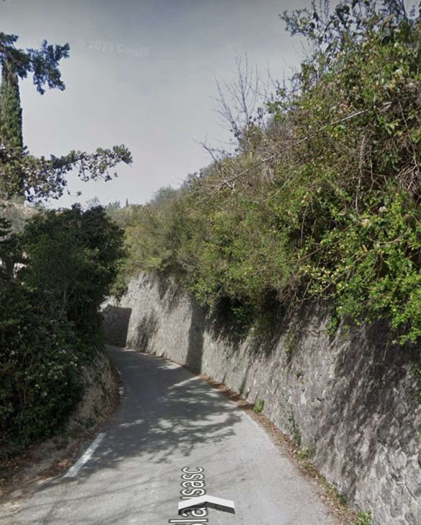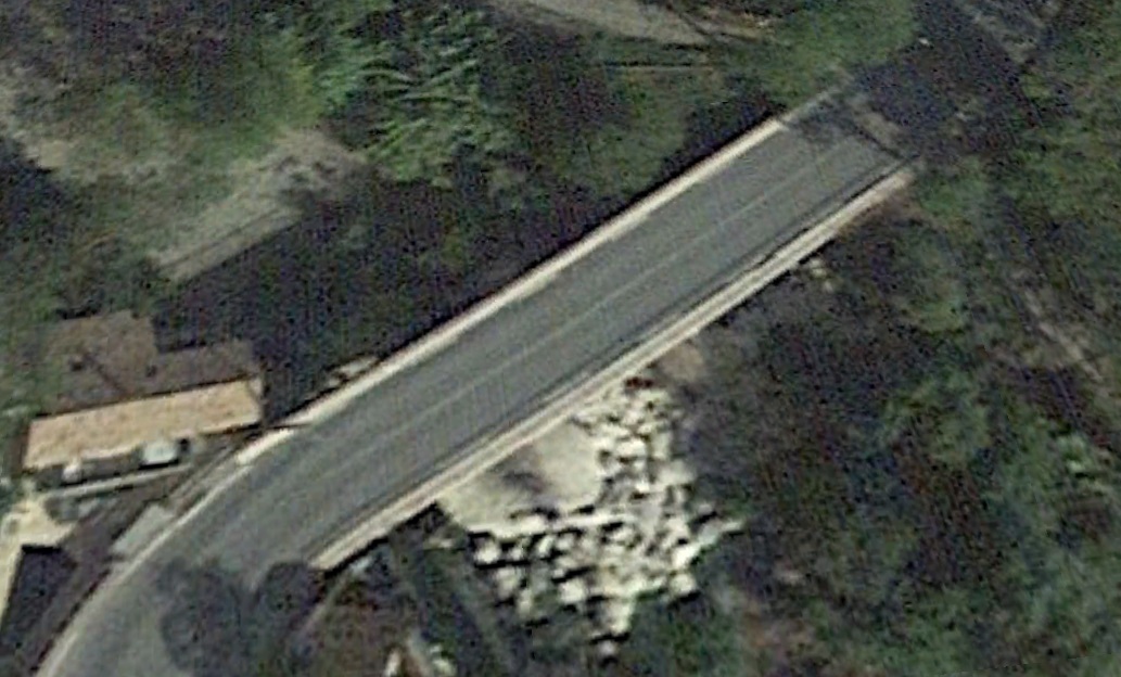 These comments from Banaudo suggest that the line was on the East side of the road, perhaps indicated by the single black line on the 1955 map extract above which crosses the side road to Peillon only a few meters to the East of the main road. It seems that North of this point the tramway was very close to the road but held above it by a retaining wall. Road and tramway came together again at the next bridge over the Paillon de l’Escarene. That bridge is marked on both of the map extracts (1955 and 2023) above. The bridge used by the old road and tramway is marked in grey on the modern map.