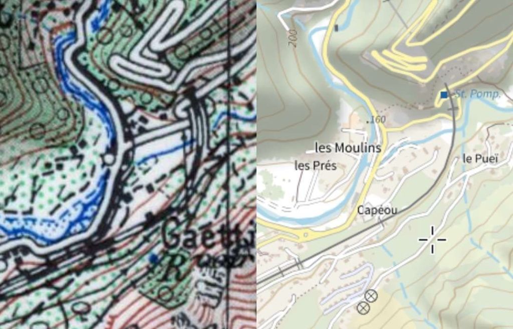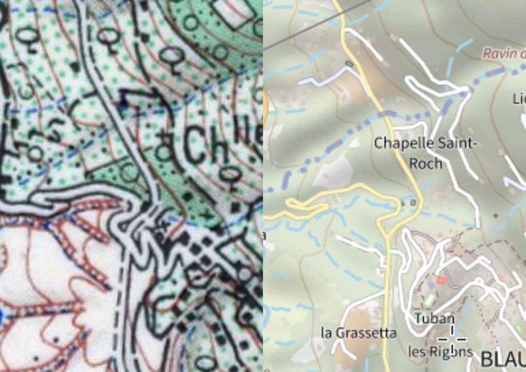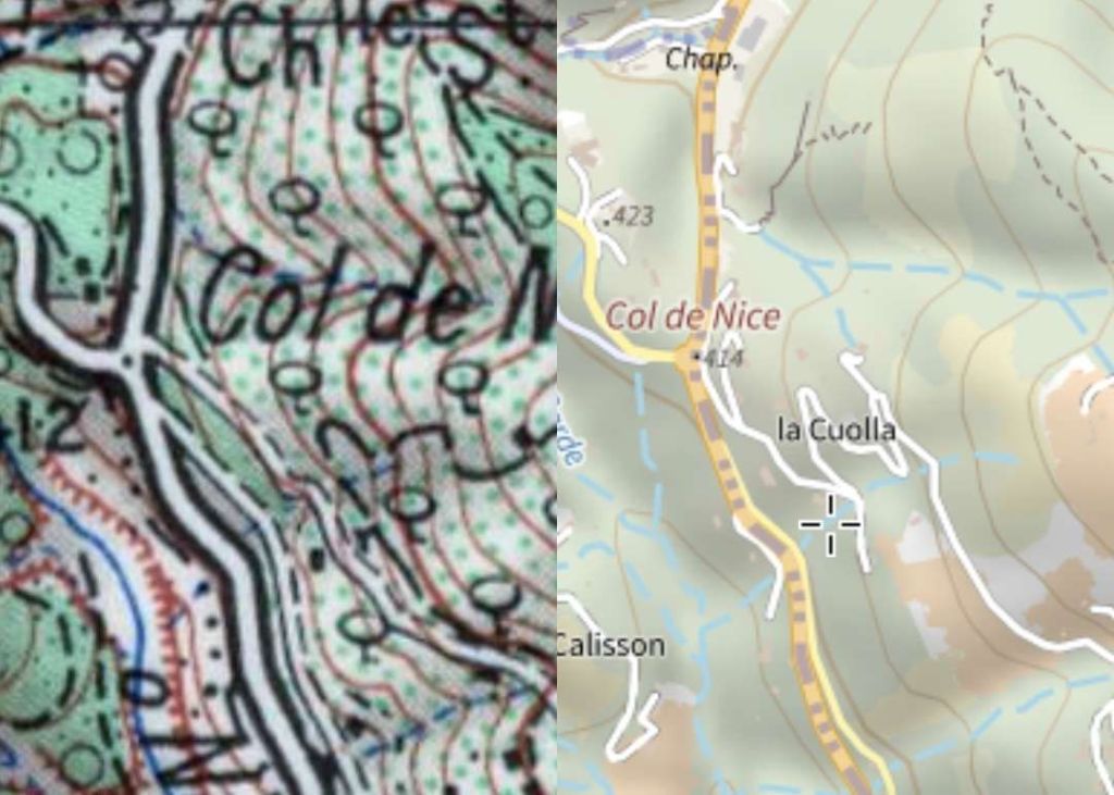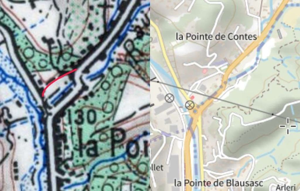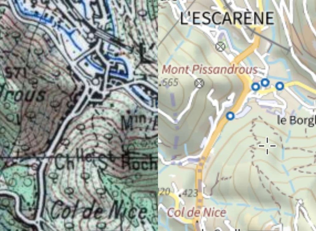 - https://remonterletemps.ign.fr/comparer/basic?x=7.353504&y=43.833178&z=14&layer1=GEOGRAPHICALGRIDSYSTEMS.MAPS.SCAN50.1950&layer2=GEOGRAPHICALGRIDSYSTEMS.PLANIGNV2&mode=doubleMap, 29th December 2023.