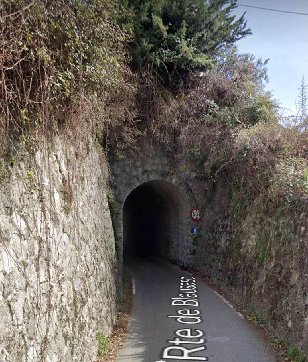 At the hamlet of La Fuont-de-Jarrier, the tramway left the road and the valley to embark on a dedicated length of almost 4 km. Banaudo tells us that the route ran through “a landscape of arid hills where only pines managed to grow on ridges of gray marl. The only locality encountered was the village of Blausasc, below which a stopping point was to be established. The line continued northwards, passing through a small tunnel at a place called La Blancarde, to join the road approaching the Col de Nice.” [1: p76]