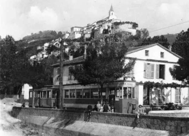The next stop was in the valley closer to Peillon and set among the mills. This stop provided a passing loop, the only one on the line. Banaudo continues: “On the right, the picturesque village of Peillon stands at 376 m at the top of a rocky spur in a site worthy of a postcard. Immediately afterwards, the valley narrows once again and forms the narrow Bausset gorge where the tramway line was established over 567 m on its own site overlooking the road, finding it again to cross the Paillon on a single-arch bridge.” [1: p72]