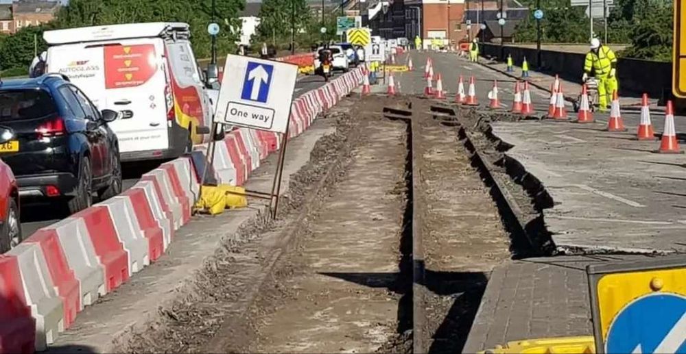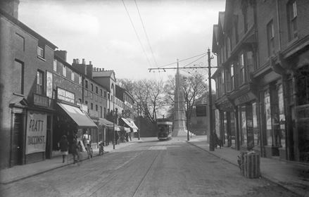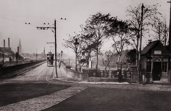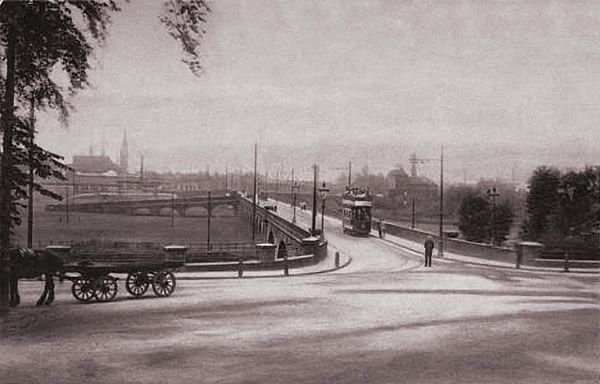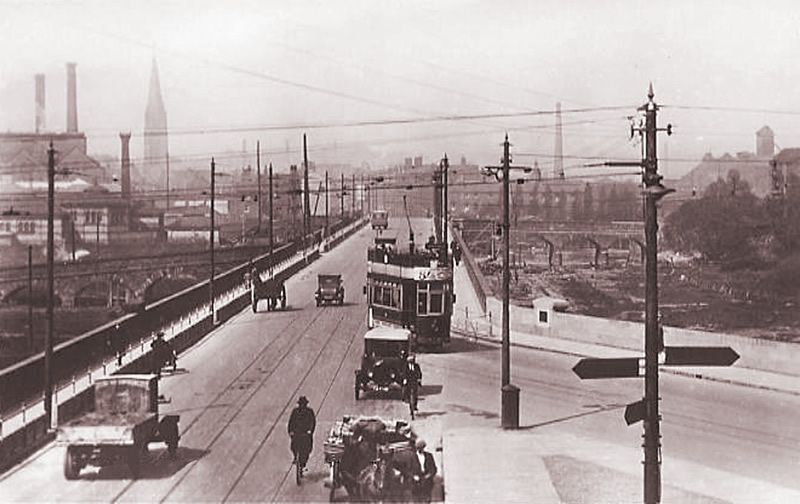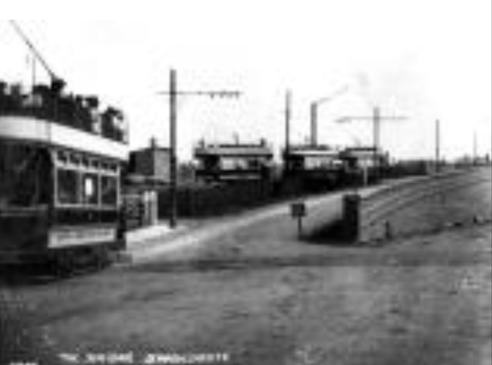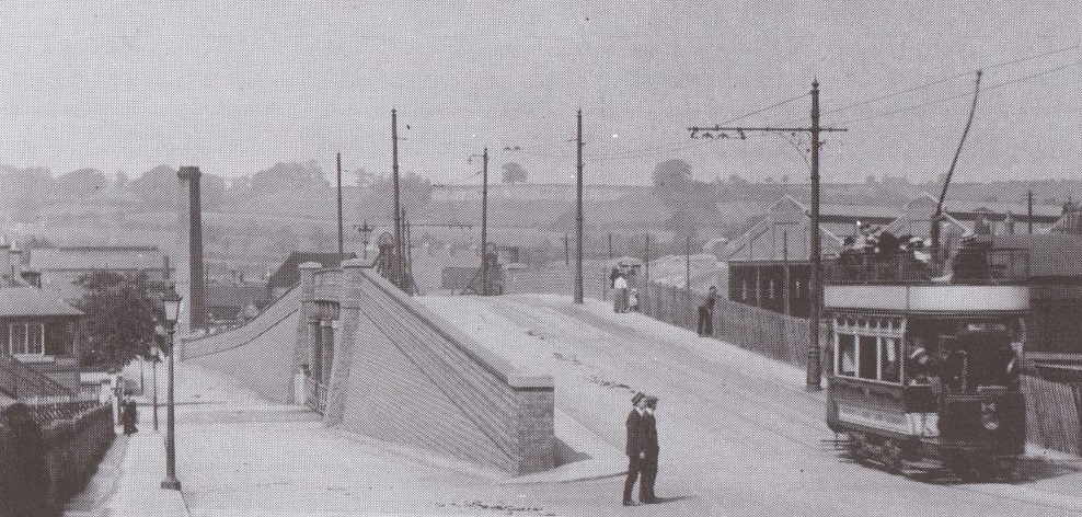The North end of the bridge on Midland Road, a tram is approaching from the North. Three trams are waiting to head out from the depot access road towards the Market Place. [29]