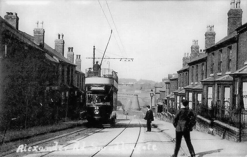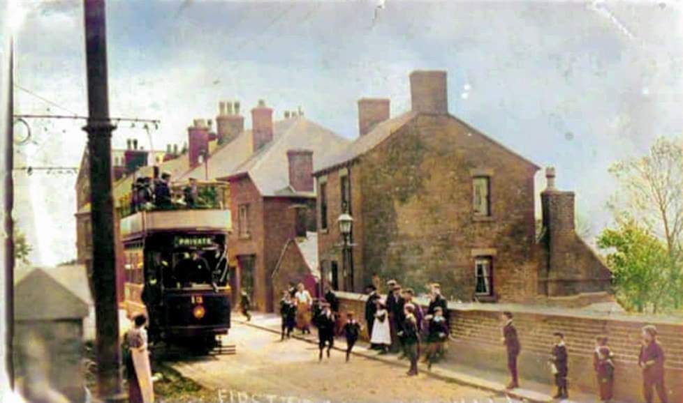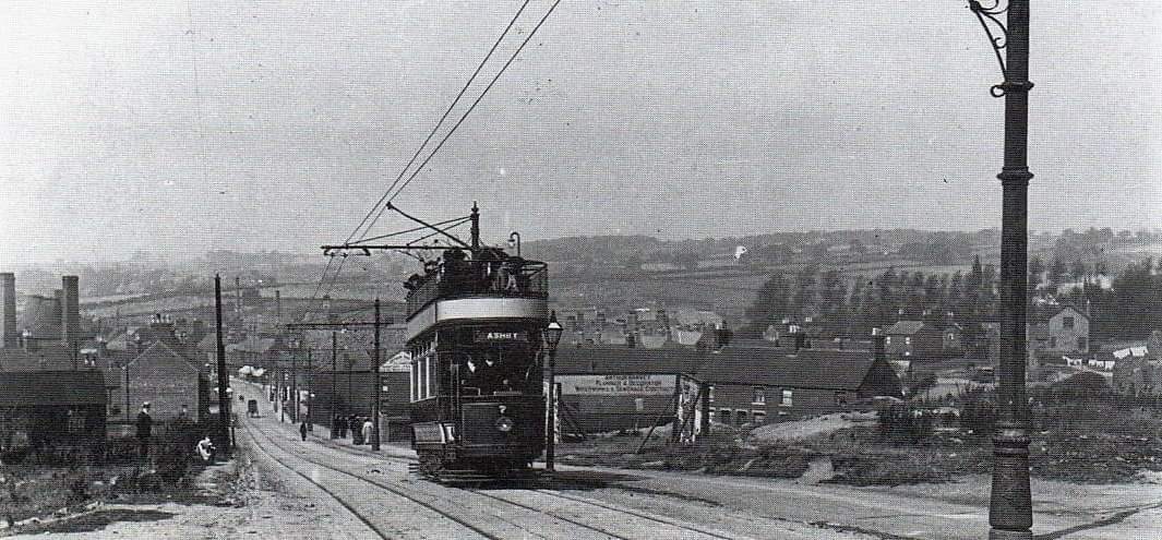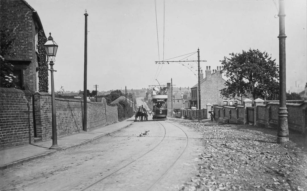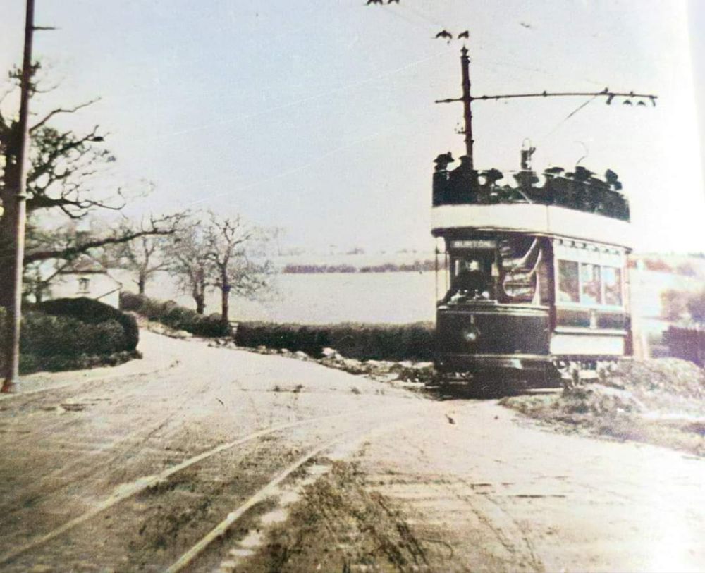 Tram No. 10 dropping down Alexandra Road towards Swadlincote Town Centre. Sharpe’s can be seen at the bottom of the hill. This image was shared by Keith Townsley on the New and Old of Swadlincote & Burton on Trent Facebook Group on 10th April 2021. [28]