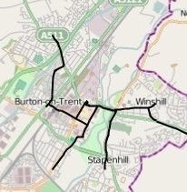 The Burton-on-Trent tramway network. The terminus of the Burton and Ashby Light Railway was to the West of the railway station which sits, in the adjacent map extract, below the second ‘n’ of Burton-on-Trent. The terminus of the tramway was close to the Town Hall on Wellington Street, just beneath the second ‘o’ of Burton-on-Trent.