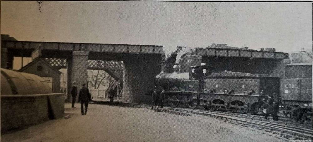 “At the western extremity is Burton, with its huge breweries which supply a great part of the world’s beer. It was intended at first that, after crossing the Trent Bridge, the railway should leave Burton up a steep slope between the Winshill and Stapenhill roads, but eventually it was mutually agreed between the town and the railway that the Corporation track should be used as far as Winshill. The new line, therefore, begins at High Bank Road, with a very deep curved gradient up to Moat Bank, where a height of 250 ft. above Burton is reached. A fine stretch of hilly country then opens to view, with Brizlincote Hall on the right; next the line dips 60 ft. to cross a lateral valley. Then it rises again, and follows a number of switchback undulations until it enters Newhall, which is 400 ft. above ordnance survey datum line. Newhall furnishes a strong contrast to the fair country west of it. Collieries, brick yards, and pipe works abound. Newhall displays the characteristics of mining villages, i.e., it is dingy, squalid, and untidy. However, its teeming population will doubtless find the new line a very great convenience, both for business and pleasure purposes, and there seems little doubt but what the Midland Railway Company will reap a continued harvest of fares from the thousands of miners and their families. From Newhall, the level of the track gradually descends until it is below 200 ft., and then leaves the Ashby main road to take a right-angled turn into Swadlincote. Here the line, after going due south for a time, is carried over the old railway the single loop to Swadlincote and Woodville before mentioned on a long bridge of steel girders, resting on blue brick piers. The bridge [as can be seen below] has a switchback appearance, while the [second view below] taken from Swadlincote goods yard, shows a Midland Railway train passing under [the bridge there]. Shortly after crossing the bridge the track takes an abrupt turn to the left, in order to resume its eastward direction. At the same place, there is a branch about two miles long, going first south and then south-west to Gresley. The road towards Ashby rises continuously until it reaches a height of 569 ft. above sea level. It passes through the heart of the Derbyshire Potteries, where a great industry is carried on in the manufacture of furnace bricks, sanitary pipes, and common earthenware. Furnaces and kilns abound in Swadlincote, and the subsidiary industry of crate making is also much in evidence.” [1: p54-55]