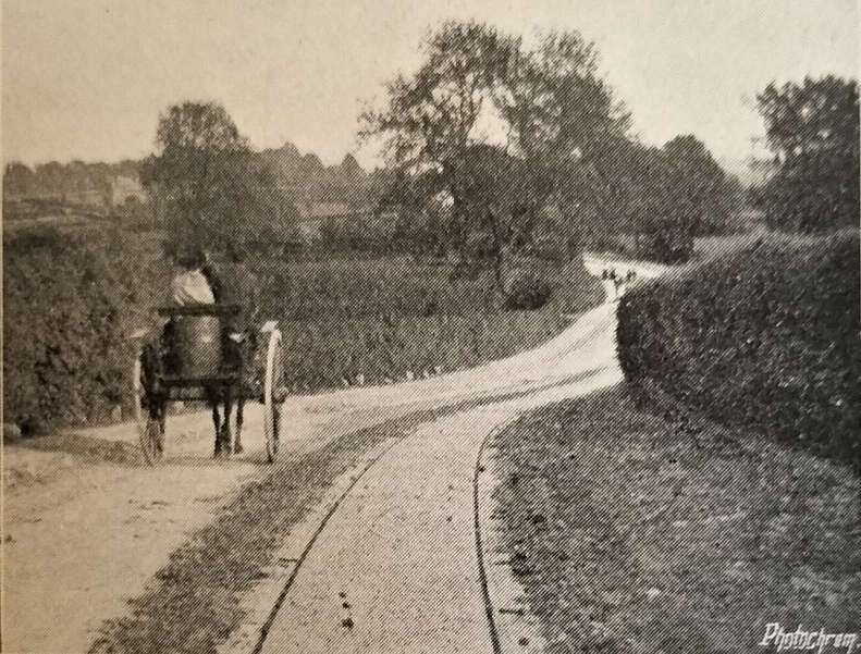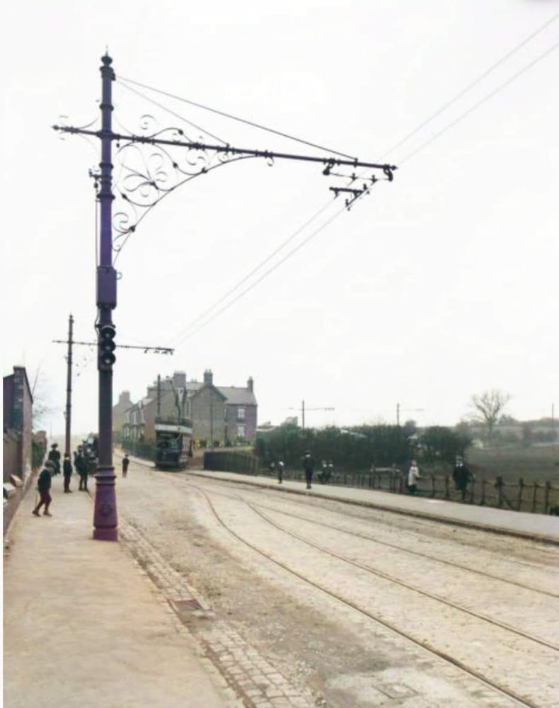 The Light Railways was “an electric railway, laid upon the public highway, with stopping places at all penny stages and intermediate points, while the various villages and towns through which it passes will practically serve as stations. … [Some] of the line … resembles that of a branch railway, fenced or hedged in on either side, this being necessary in consequence of short cuts across fields or garden plots. … The electric current is taken from an overhead cable, suspended from steel poles or standards, placed at frequent intervals along the line of route.” [1: p54]