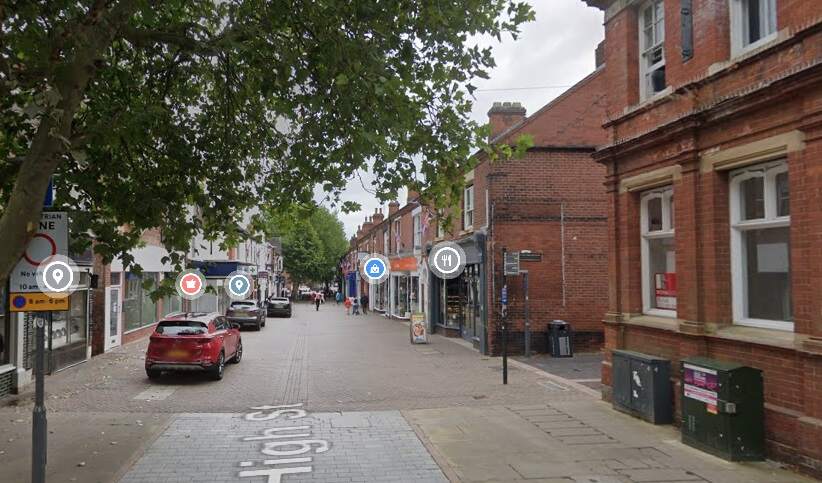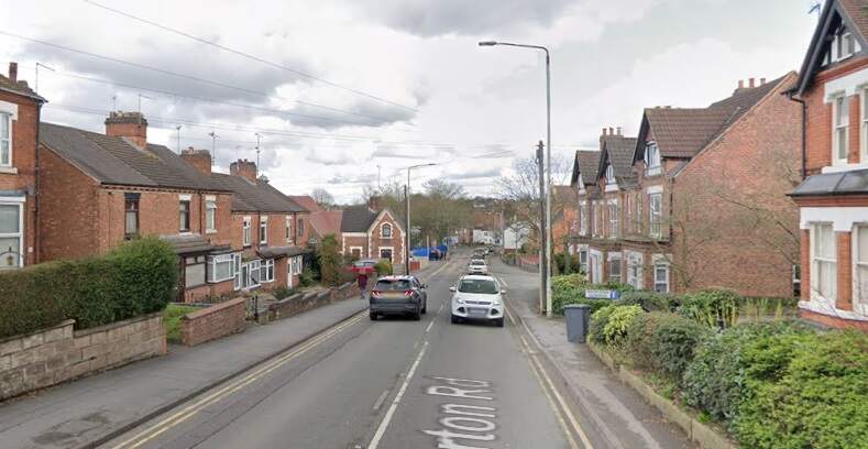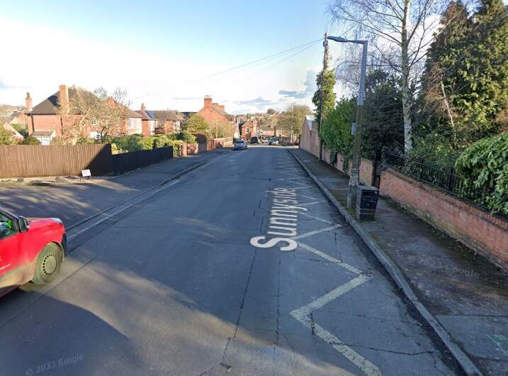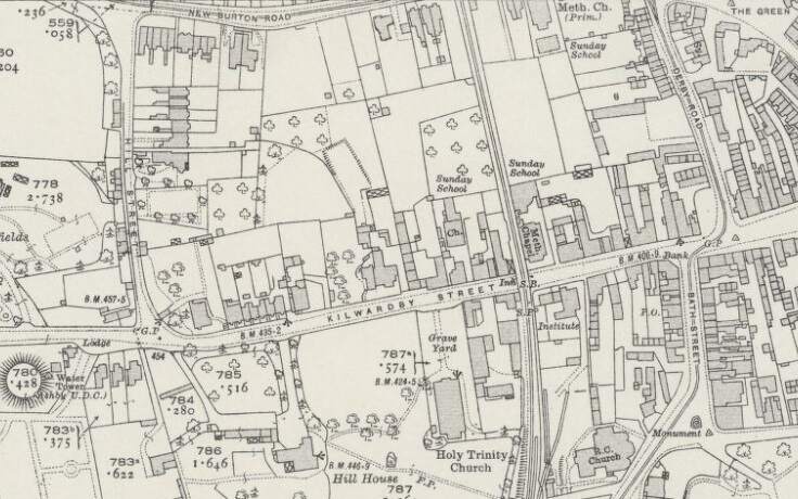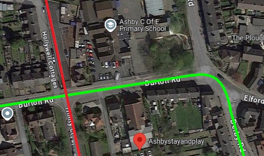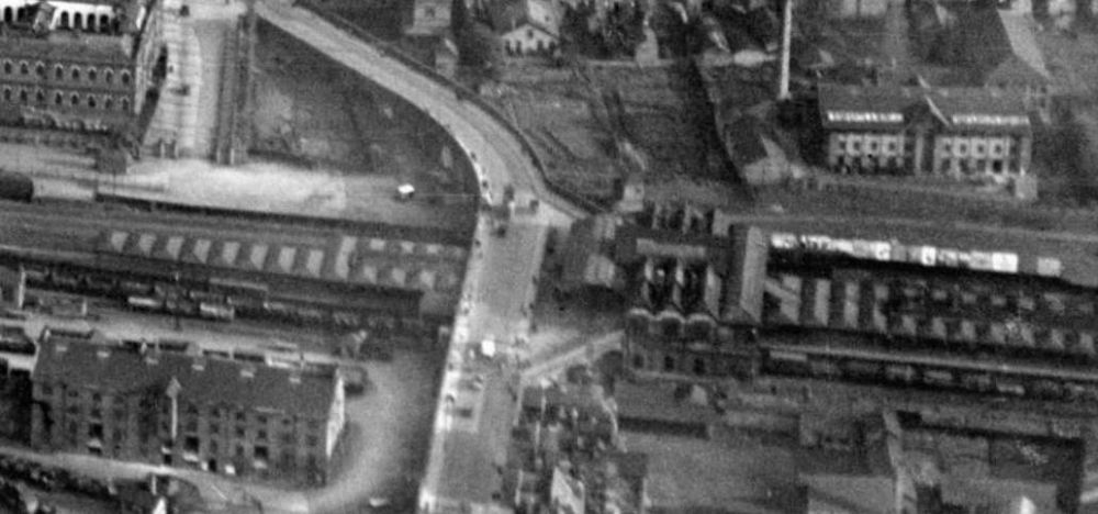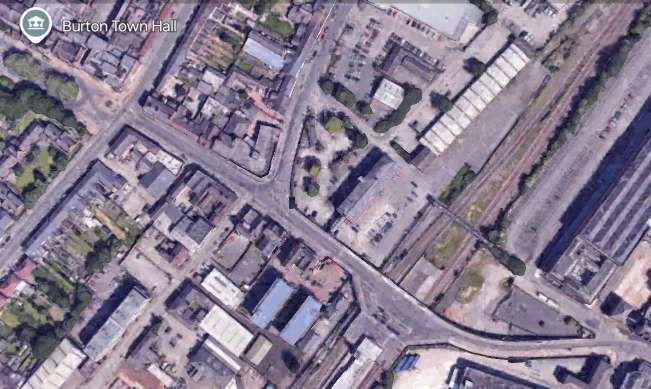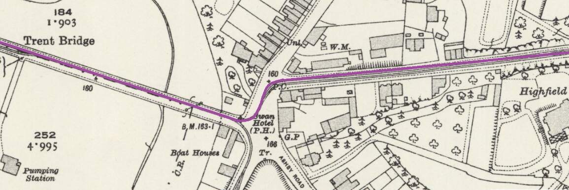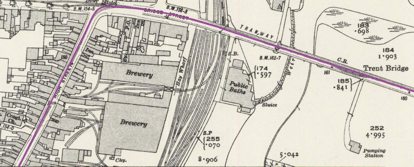The terminus of the Burton and Ashby Light Railway was outside the post office on Wellington Street, just a stone’s throw from Burton Town Hall and the railway station just a short distance to the Southeast. The lilac line superimposed on the 1920 25″ OS map (published in 1922), shows the route of the line which ran along the town’s tramway network. [4]The same area in the 21st century. [Google Earth, October 2024]The railway station, seen from the Northwest in 1927. Burton-on-Trent Railway Station Passenger Facilities were at road level above the station platforms. Borough Road ran across the front of the station building, at the centre of this extract from Britain From Above aerial image No. EPW019724. The route followed by trams from the Burton and Ashby Light Railway started off the bottom of the image on Wellington Street and followed Borough Road. [11]The 1920 25″ OS mapping shows the route continuing along Station Street and turning up High Street. [5]Approximately the same area in the 21st century. [Google Earth, October 2024]Burton and Ashby Light Railway trams continued Northeast on High Street. [6]The Light Railway trams continued to follow the track of the Corporation Tramways across Trent Bridge. [7]The Light Railway’s trams continued to the East along Bearwood Hill Road. [7]Trent Bridge and Bearwood Hill Road to the East.