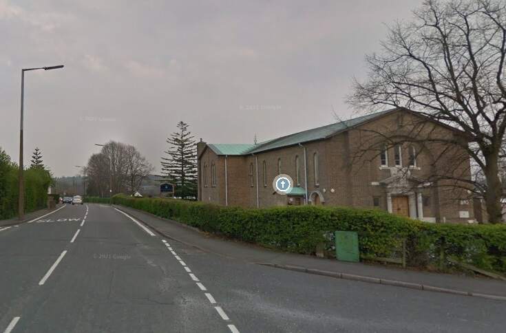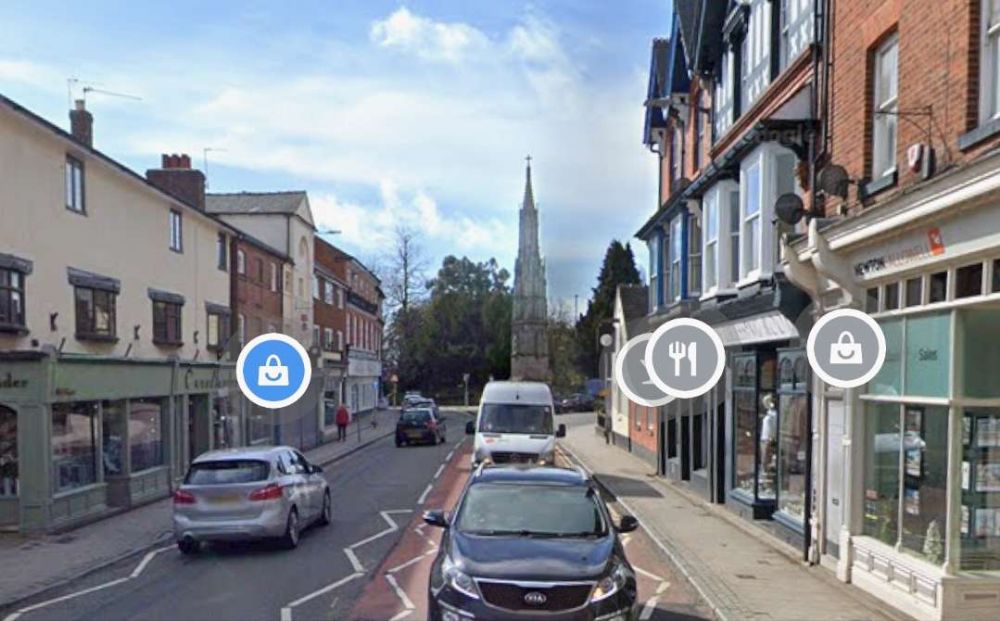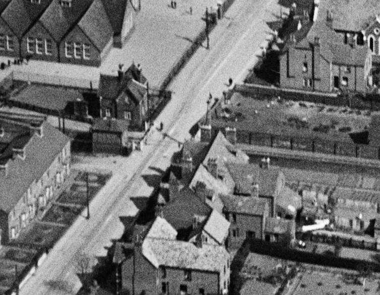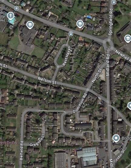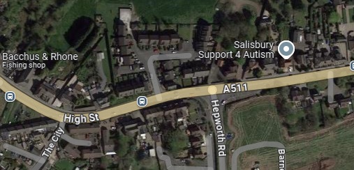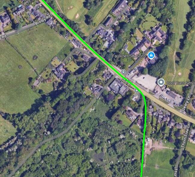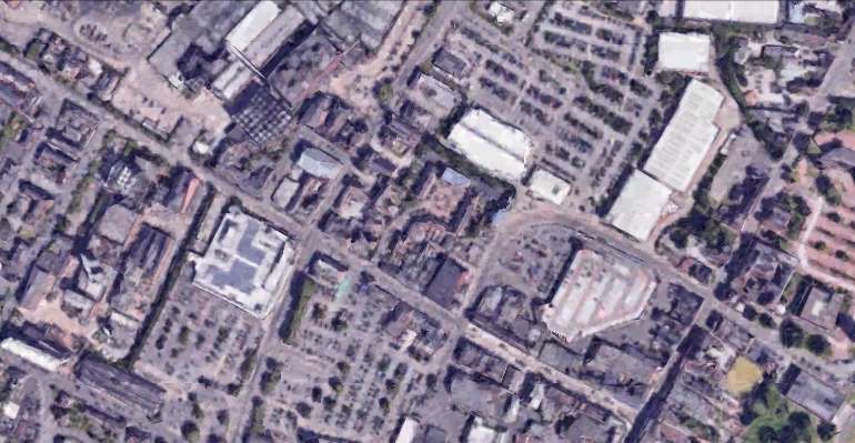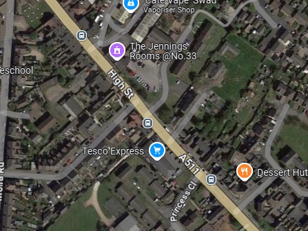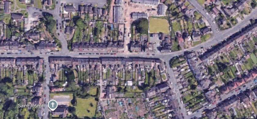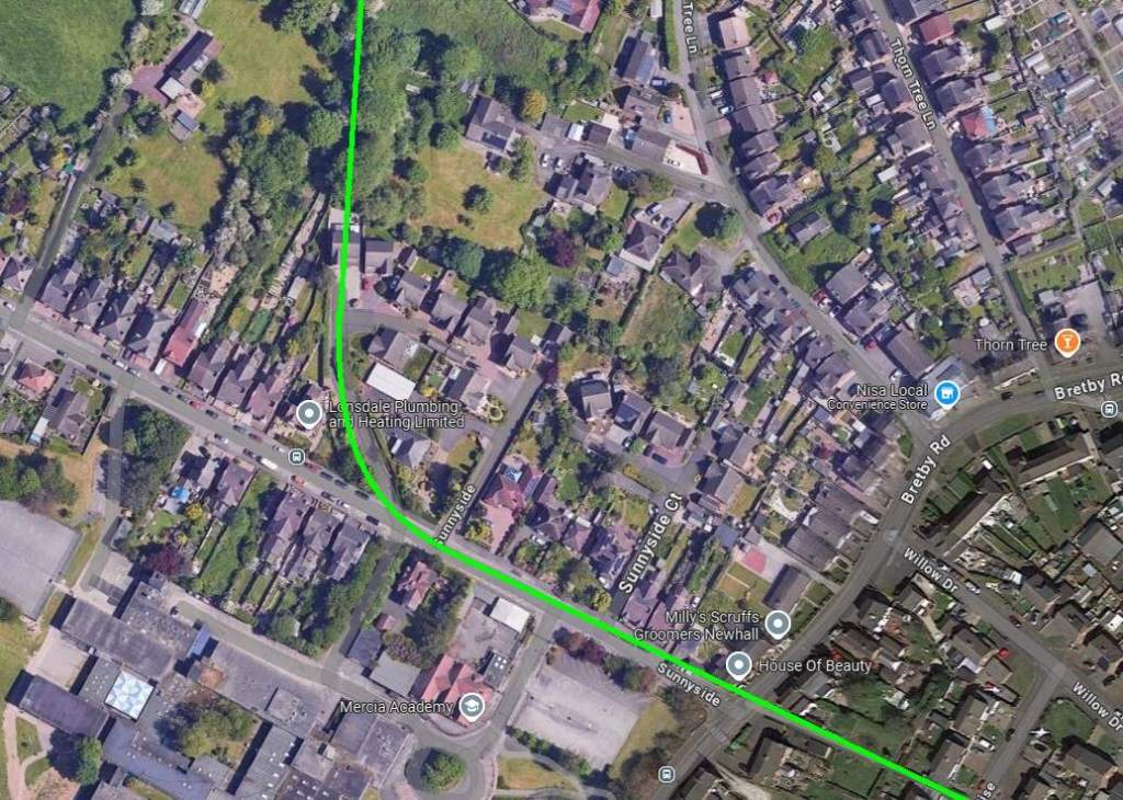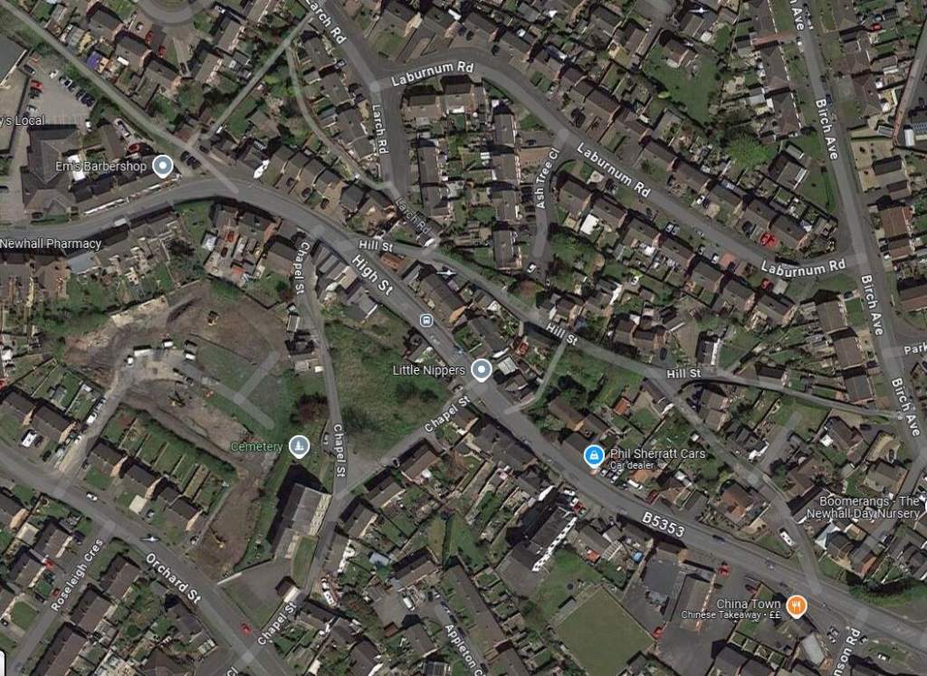These two extracts from Google Maps satellite imagery cover the same length of the Light Railway as shown on the extract from the 1921 25″ Ordnance Survey above. The Southeastern length of what was Hill Street is now the A514 which bypasses the centre of the town. [Google Maps, October 2024]