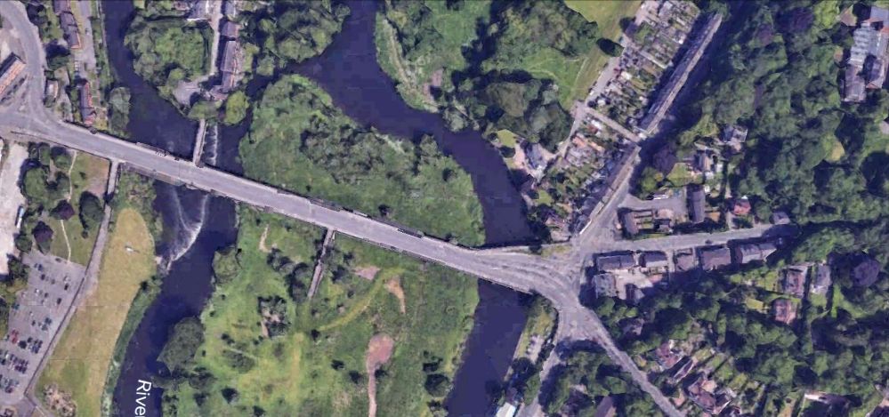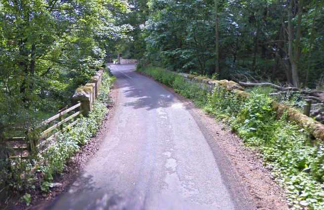 A distant view from the Southwest of the bridge carrying the access road to South Moor which is on the left of this image. The stone-arched bridge is just to the right of centre. [Google Streetview, April 2011]
