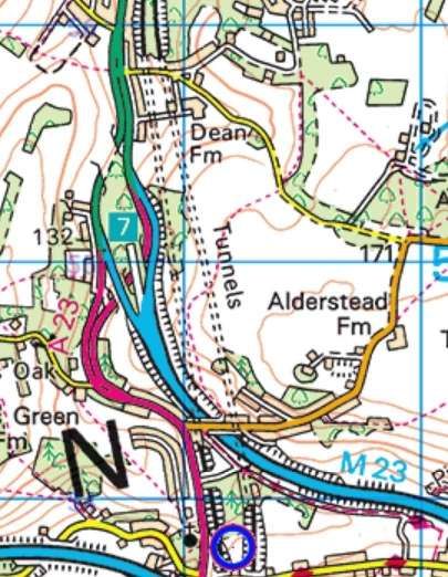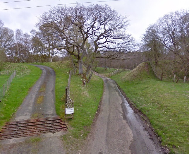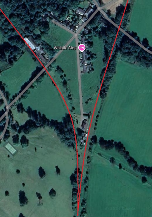From this point, the line turns to a more northerly direction as this next extract from the railmaponline.com satellite imagery shows. An accommodation track and Blind Burn next passed under the line of the railway. The image below shows the location.