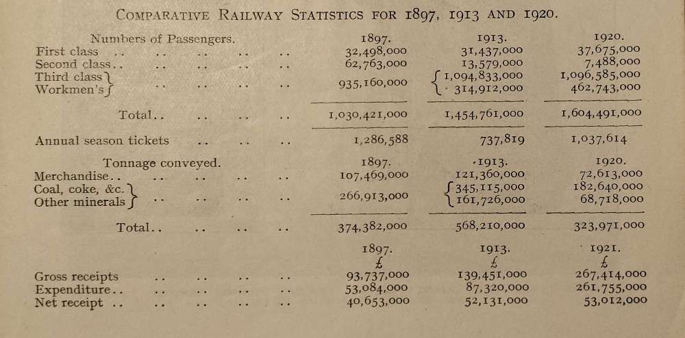 “Railway mileage in 1897 was officially given as 21,433 miles for the British Isles, of which 11,732 miles were double track or more. In the course of the past 25 years the total length of railway (officially stated as 23,734 miles according to the latest returns available) has increased by 2,300 miles, and double track or more is provided on no less than 13,429 miles. Detailed figures as to the mileage laid with more than two lines in 1897 cannot be given; but there are now about 2,000 miles with from three to 12 or more lines abreast. Therefore, while the total route mileage increase is not so great indeed, it could not be, seeing that all the trunk lines and main routes except the Great Central London extension were completed long before 1897, and additions are therefore short or of medium length – there has been a very large proportionate increase in multiple track mileage. As the extent to which multiple track is provided is an important indication of traffic increase, this aspect calls for due emphasis. … The total paid-up capital of British railways, including in each case nominal additions, has increased from £1,242,241,166 to £1,327,486,097, that is, by some £85,000,000, apart from the cost of new works, etc., paid for out of revenue.” [1: p377]