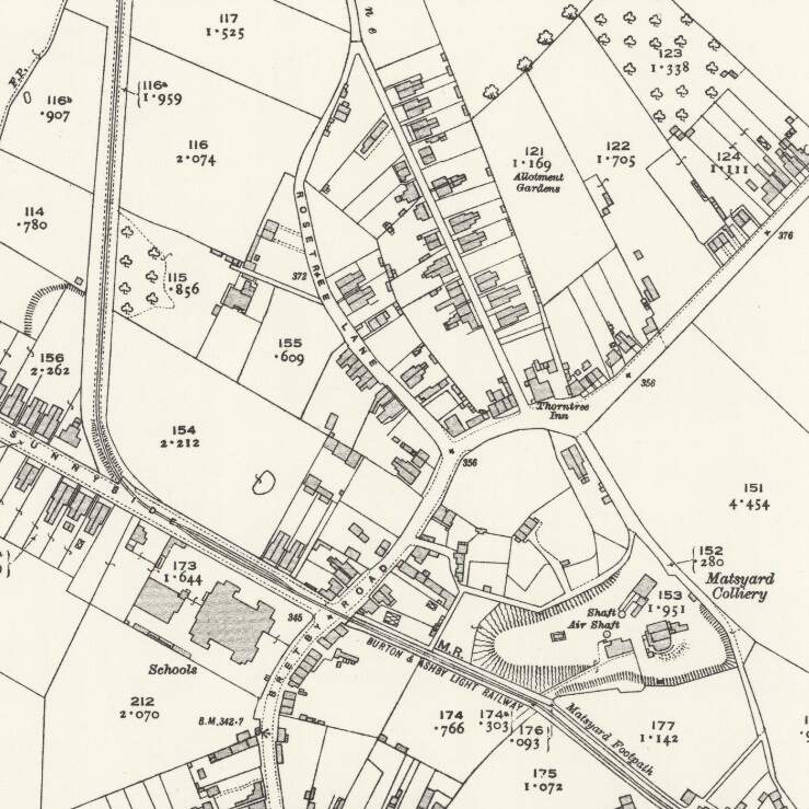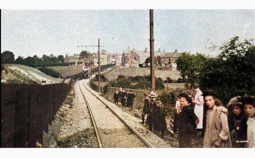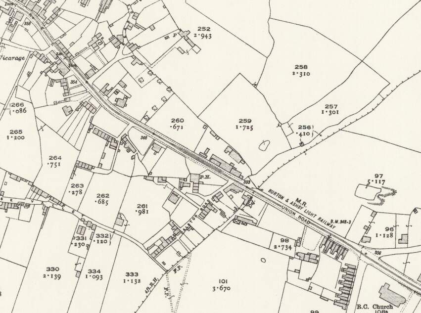 The Burton and Ashby Light Railway turned South off Burton Road (A511) to the East of what was the Stanhope Arms. [Google Streetview, August 2023]A tram on what appears to be the length of the line between the A511 and Sunnyside, (c) Public Domain. [9]The Burton and Ashby Light Railway followed its own fenced route South as Far as Sunnyside where it turned to the East. [16]The modern satellite image has the approximate route of the tramway superimposed in green. Before reaching Sunnyside, the railway followed what is now the line of ‘The Tramway’ a modern small estate road. It then turned towards the East running down Sunny side and across it junction with Bretby Road. [Google Maps, October 2024]Looking Northwest from Sunnyside, the green line shows the route of the old railway. [Google Streetview, March 2023]Looking Southeast along Sunnyside, the old railway ran down the centre of the road. There was a passing loop immediately in front of the camera. [Google Streetview, March 2023]A view looking Northwest on Sunnyside – on the right of this image a tram can be seen approaching Sunnyside from the North. This image was shared on the Newhall, Stanton & BretbyYesteryears Facebook Group by Keith Townsley on 5th December 2020, (c) Public Domain. [27]On this very similar image, a tram is turning onto Sunnyside. This image was shared on the Newhall, Stanton & Bretby Yesteryears Facebook Group by Marcus Payne on 10th September 2020, (c) Public Domain for the original image. [24]Looking Southeast along Sunnyside towards Bretby Road with the Light Railway rails in the road surface. This image was shared on the Newhall, Stanton & Bretby Yesteryears Facebook Group by Marcus Payne on 12th September 2020, (c) Public Domain for the original image. [24]Looking Southeast from Sunnyside across its junction with Bretby Road and along the line of the Light Railway which ran next to Matsyard Footpath. This image was shared on the Newhall, Stanton & Bretby Yesteryears Facebook Group by Julie Brown on 14th August 2022, (c) Public Domain [25]A similar view in 2024. The Light Railway ran along the line of the footpath. {Google Streetview, February 2023]The view towards Newhall from Bretby Road. This image was shared on the Newhall, Stanton & Bretby Yesteryears Facebook Group by Marcus Payne on 10th September 2020, (c) Simnett, Public Domain for the original. [24]This further extract from the 1920 25″ Ordnance Survey shows the line entering Newhall village alongside Matsyard Footpath and then running along the High Street. [16]Approximately the same area as it appears on Google Maps satellite imagery. The line entered at the top left corner of this image and then ran onto and along High Street (B5353). [Google Maps , October 2024]Looking Northwest from High Street, Newhall along Matsyard Footpath. The green line shows the approximate line of the old railway. [Google Streetview, February 2023]A tram approaching High Street, Newhall from the Northwest. This image was shared on the Newhall, Stanton & Bretby Yesteryears Facebook Group by Marcus Payne on 10th September 2020, (c) Public Domain for the original image. [24]Tram No. 13 entering Newhall at the same location as the Google Streetview image above, (c) Public Domain. [18]High Street, Newhall. This image was shared on the Newhall, Stanton & Bretby Yesteryears Facebook Group by Marcus Payne on 10th September 2020, (c) Public Domain for the original image. [24]A tram on Newhall High Street. This image was shared on the Newhall, Stanton & Bretby Yesteryears Facebook Group by Julie Brown on 16th January 2023, (c) Public Domain [26]The line ran on Southeast along High Street, Union Road and Newhall Road (B5353) passing St. Peter & St. Paul’s Catholic Church (which appears bottom-right on this map extract). [16]A tram on High Street/Union Street, Newhall. This image was shared on the Newhall, Stanton & Bretby Yesteryears Facebook Group by Julie Brown/Keith Townsley on 15th February 2023, (c) Public Domain. [24] Much the same location in the 21st century. [Google Streetview, August 2022]Approximately the same area as that shown on the extract from the 1920 25″ Ordnance Survey. [Google maps, October 2024]Looking Southeast along Newhall Road, B5353 with St. Peter and St. Paul Roman Catholic Church on the right of the image. The Button and Ashby Light Railway ran down Newhall Road towards Swadlincote. [Google Streetview, Aril 2019]