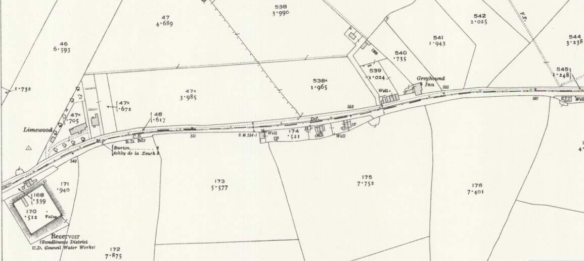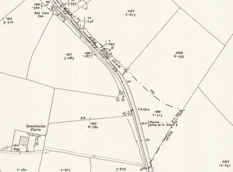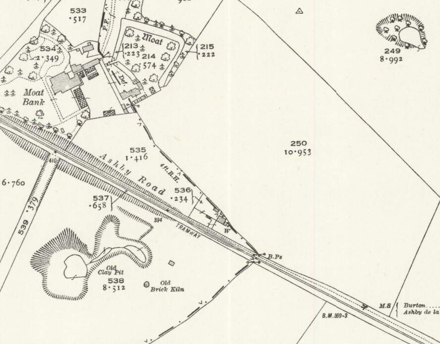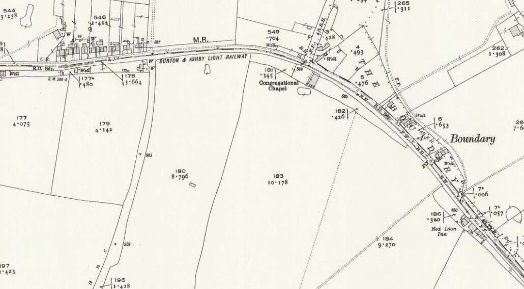 The Burton and Ashby Light Railway to the East of Woodville. [20]The Burton and Ashby Light Railway further to the East. At Boundary the line/road run Southeast towards Ashby. [20]Further to the Southeast, the bottom of this extract is also the bottom of the particular map sheet of the 25″ Ordnance Survey of 1920. [20]