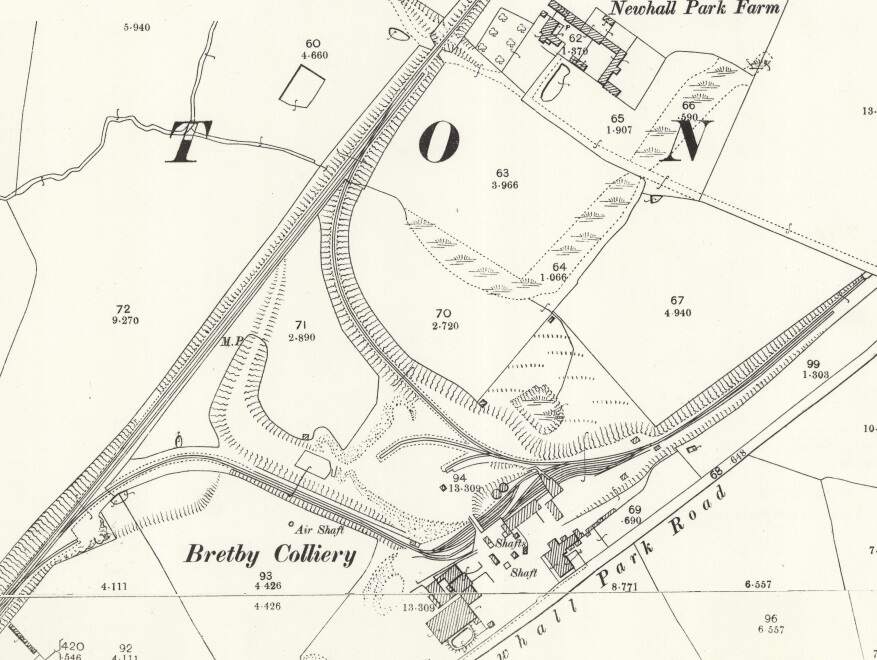 Glendenning explains that the rail network in the area between Burton and Ashby-de-la-Zouch was, of necessity design round the topography of South Derbyshire which resulted in the Midland Railway bypassing some significant industry and associated communities. A branch, built by the Midland Railway, off the main line penetrated the South Derbyshire Hills to serve Bretby Colliery. Another Midland Railway branch line described a rough horseshoe alignment, leaving the mainline not far from the Bretby Colliery line. This second branch served Newhall, Swadlincote and Woodville with a short branch designated as the Woodville Goods Branch.