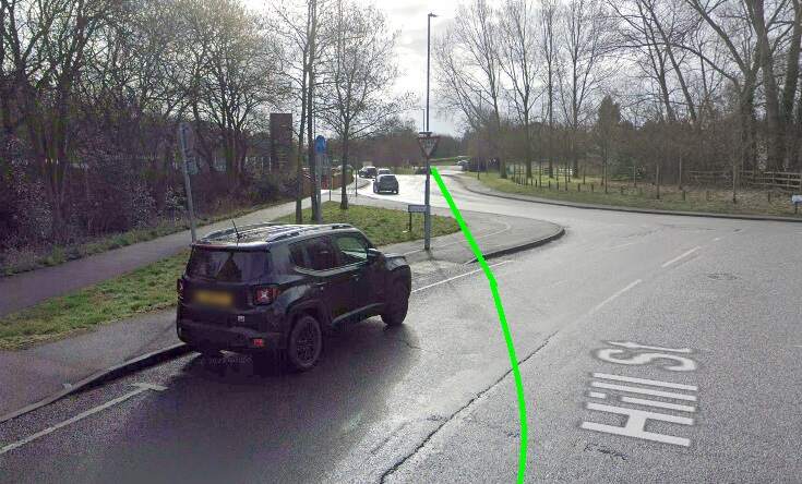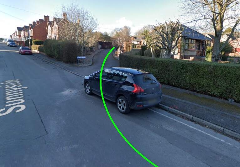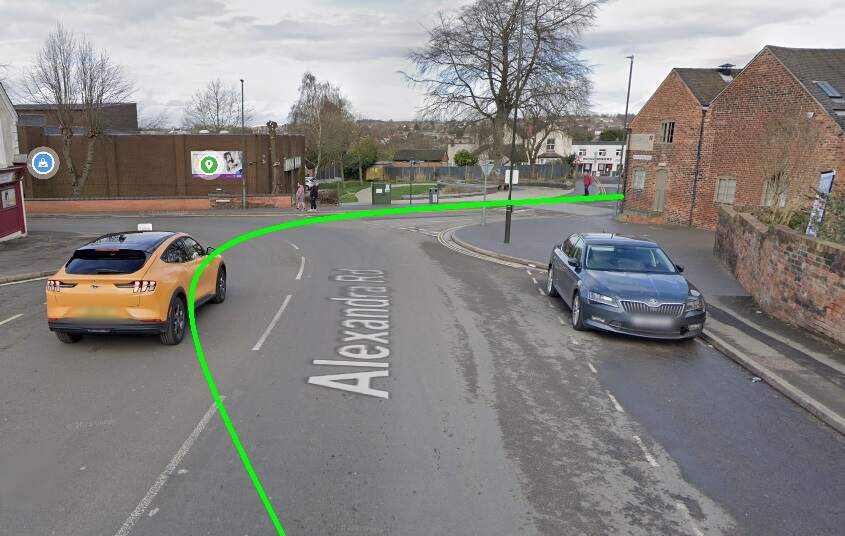 The Light Railway turned South into Alexandra Road by means of a wide arc. The green line gives the approximate alignment of the double track tramway at this location. [Google Streetview, March 2023]